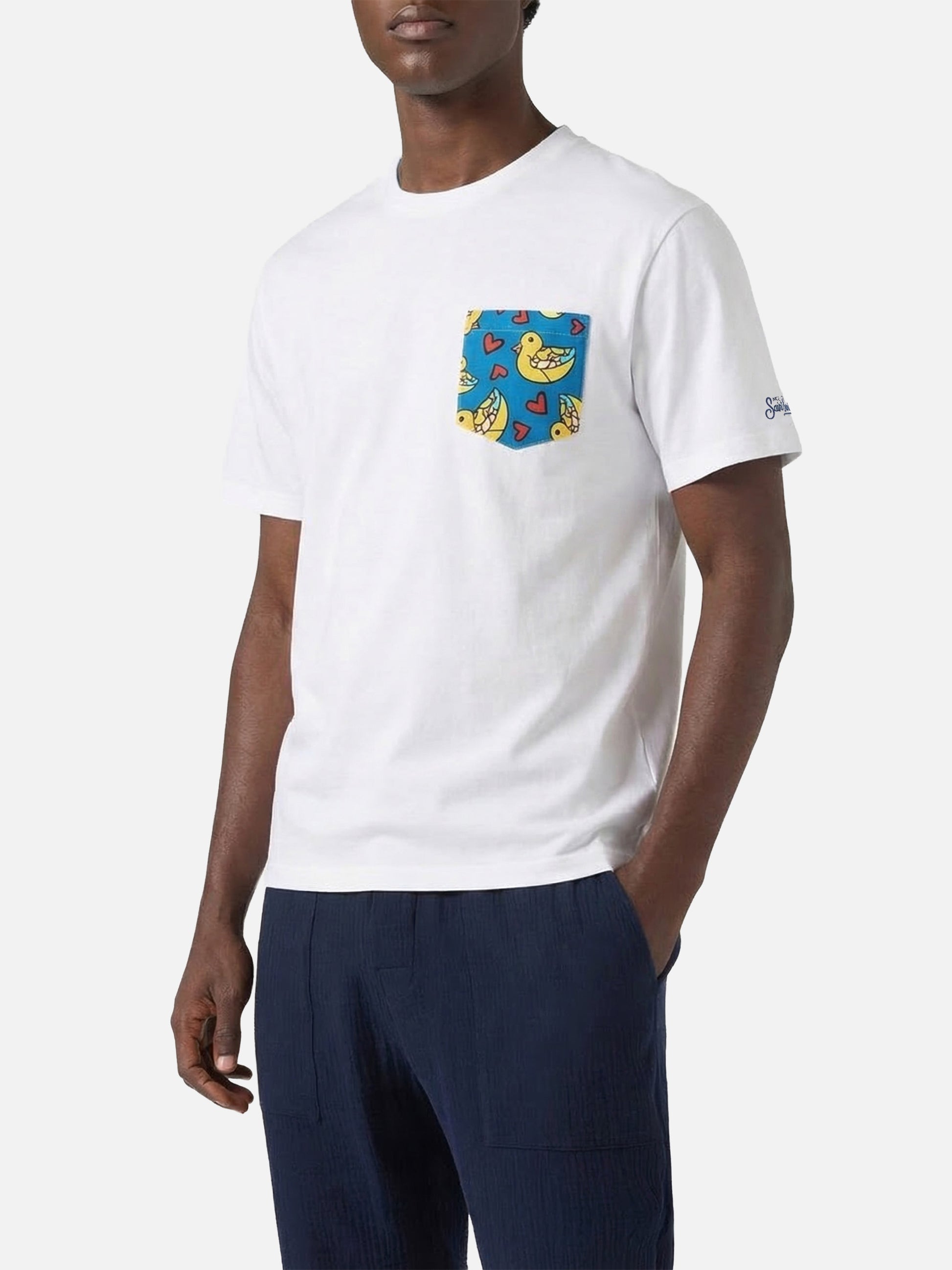 Introducing our Blanche T-shirt, a timeless cotton jersey tee that's a wardrobe staple. Featuring short sleeves and a front printed pocket, this tee offers a unique twist on classic style. Complete with the Saint Barth logo embroidered on the left sleeve, making it an off-duty essential you'll want to wear on repeat. This special edition collaboration with the famous artist Romero Britto adds a touch of exclusivity to your wardrobe. White cotton jersey t-shirt Classic fit Romero Britto motivs all over printed pocket Crewneck Exclusive signature St. Barth embroidery on the sleeve Regular fit True to size Romero Britto Special Edition Composition: 100% cotton (pocket excluded) Size L has a chest width of 54 cm (front and back) and varies by 2.5 cm for each size; shoulder width of 45 cm and varies by 2 cm for each size; length of 72 cm and varies by 2 cm for each size Please note that all measurements provided are approximate and subject to a tolerance of 1-2 cm due to manual measurement. This tolerance range is normal and should be expected. Model is 185 cm and wears a size large