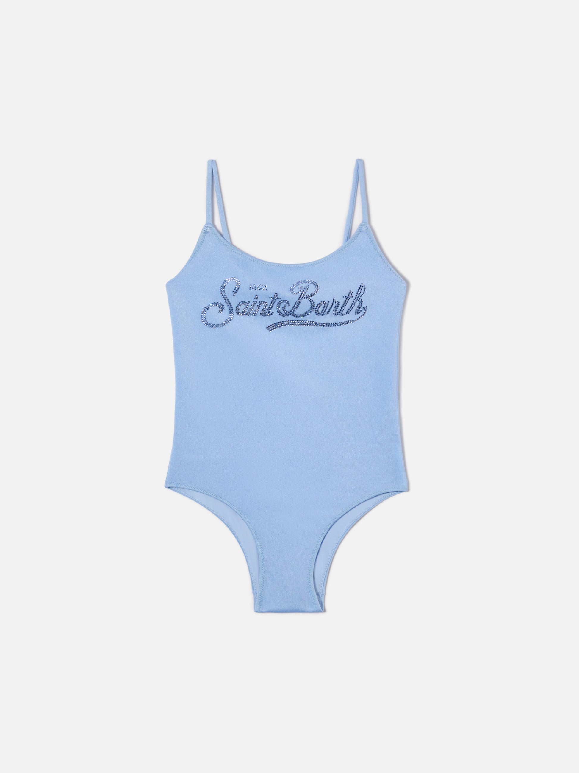 Cecille Jr one-piece swimsuit in glossy finish fabric with rhinestone logo