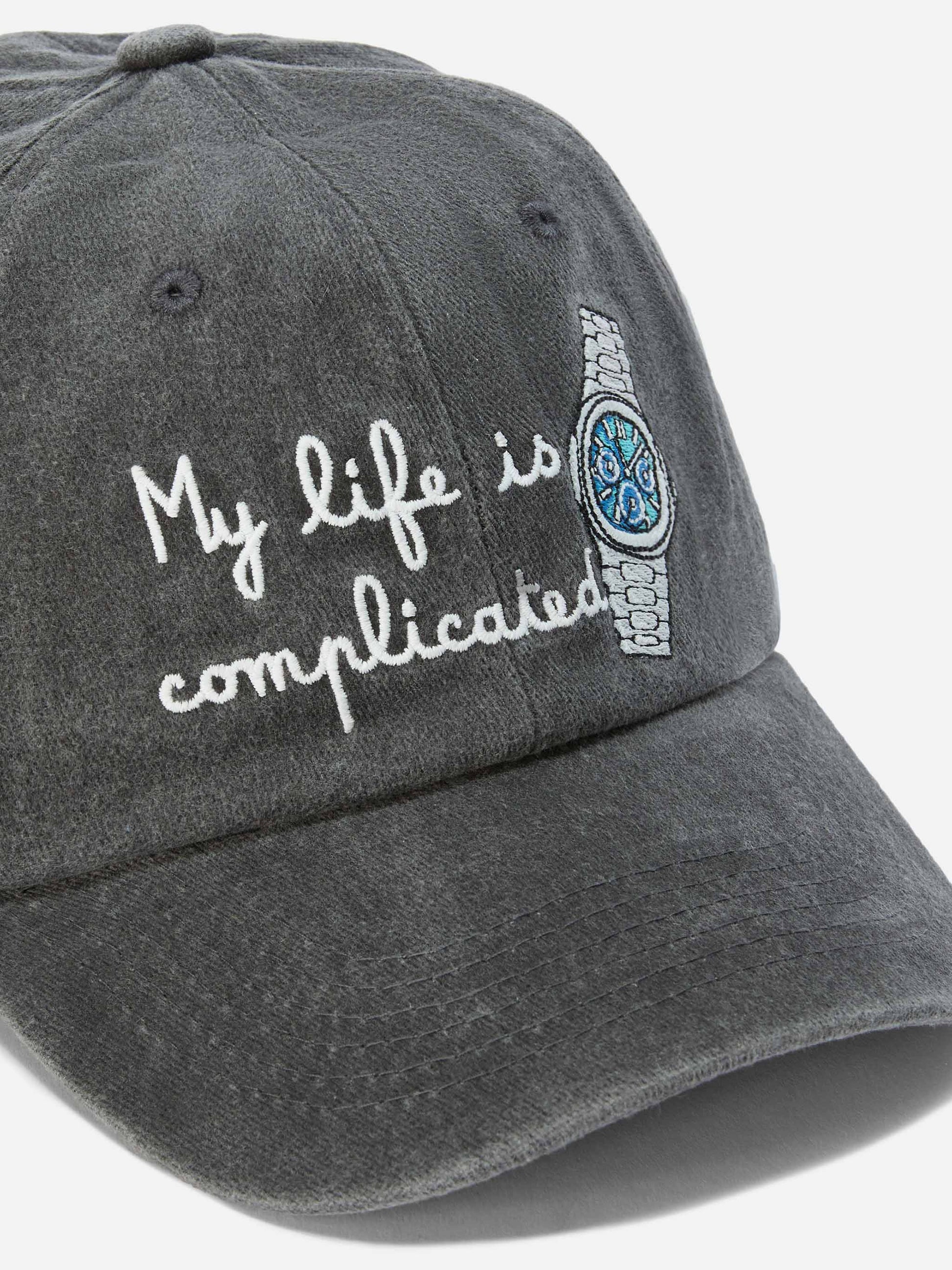 Davis Baseball Cap in denim with “My life is complicated” embroidery