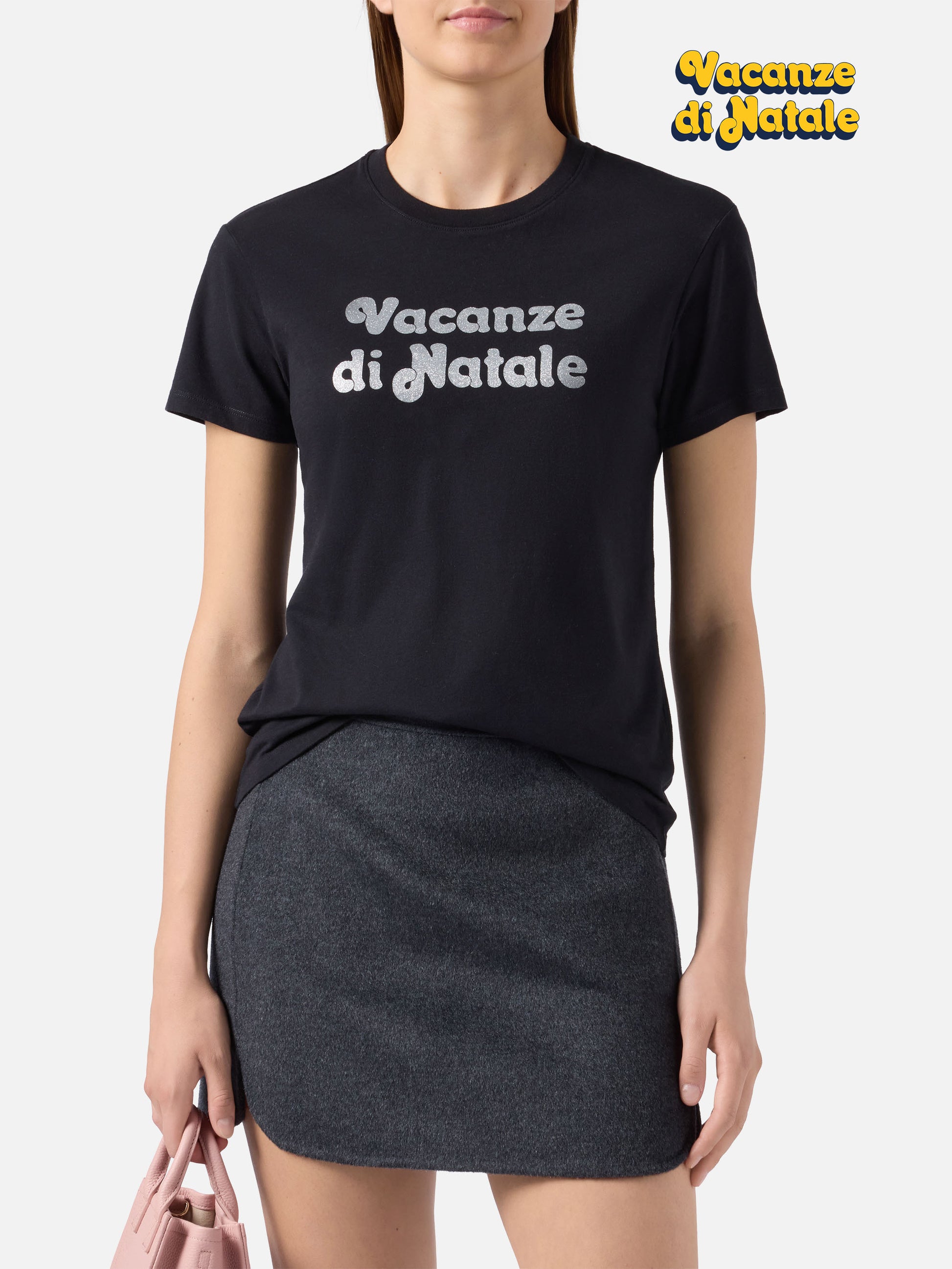 Emilie Baumwoll-T-Shirt in Schwarz mit „Vacanze di Natale“-Glitzerdruck | VACANZE DI NATALE SONDERAUSGABE