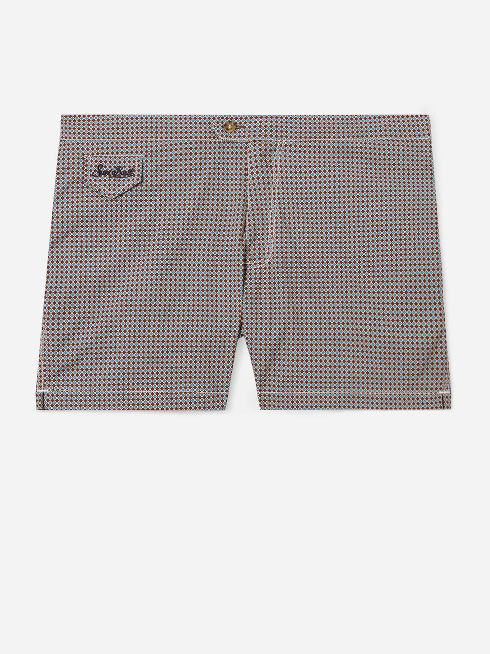 The Harrys swim shorts are crafted from lightweight breathable fabric designed to provide comfort and freedom of movement. The all-over geometric print in brown and light blue tones gives the design a refined and distinctive graphic look. The construction features a tailored waistband with horn-effect logo button, a front fly with zip and elasticated side panels for a stable and comfortable fit. Functional details such as side welt pockets, a zipped back welt pocket and the elastic antibacterial inner mesh enhance practicality and breathability. The style is part of the Ties capsule.
