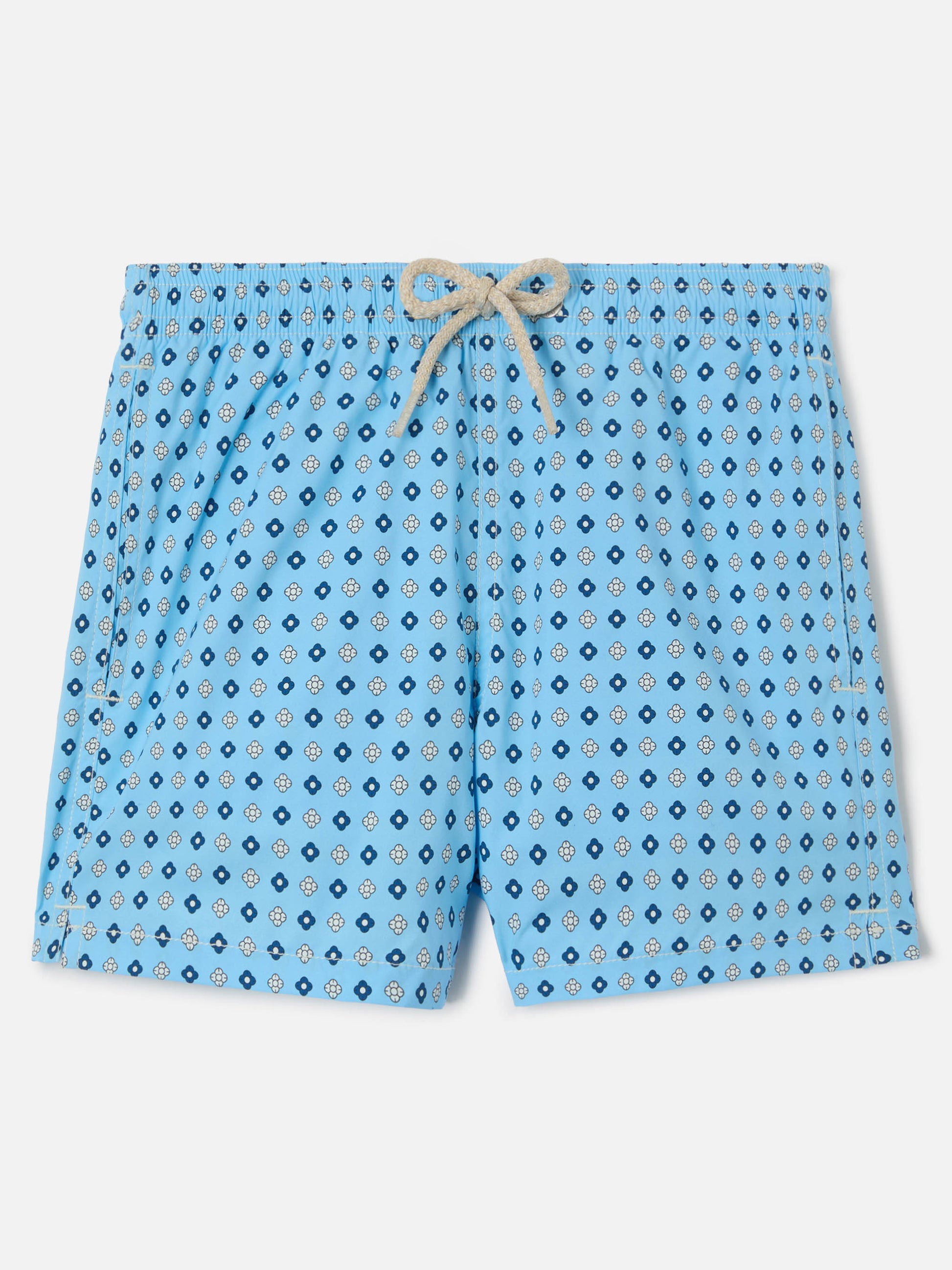 The Jean Lighting Stretch boys swim shorts are designed to provide comfort and freedom of movement during summer days. The stretch, breathable fabric ensures a comfortable fit, while the light blue base features an all-over geometric floral print for a refined and contemporary look. An elasticated waistband with adjustable drawstring and an antibacterial inner mesh complete the functional design.