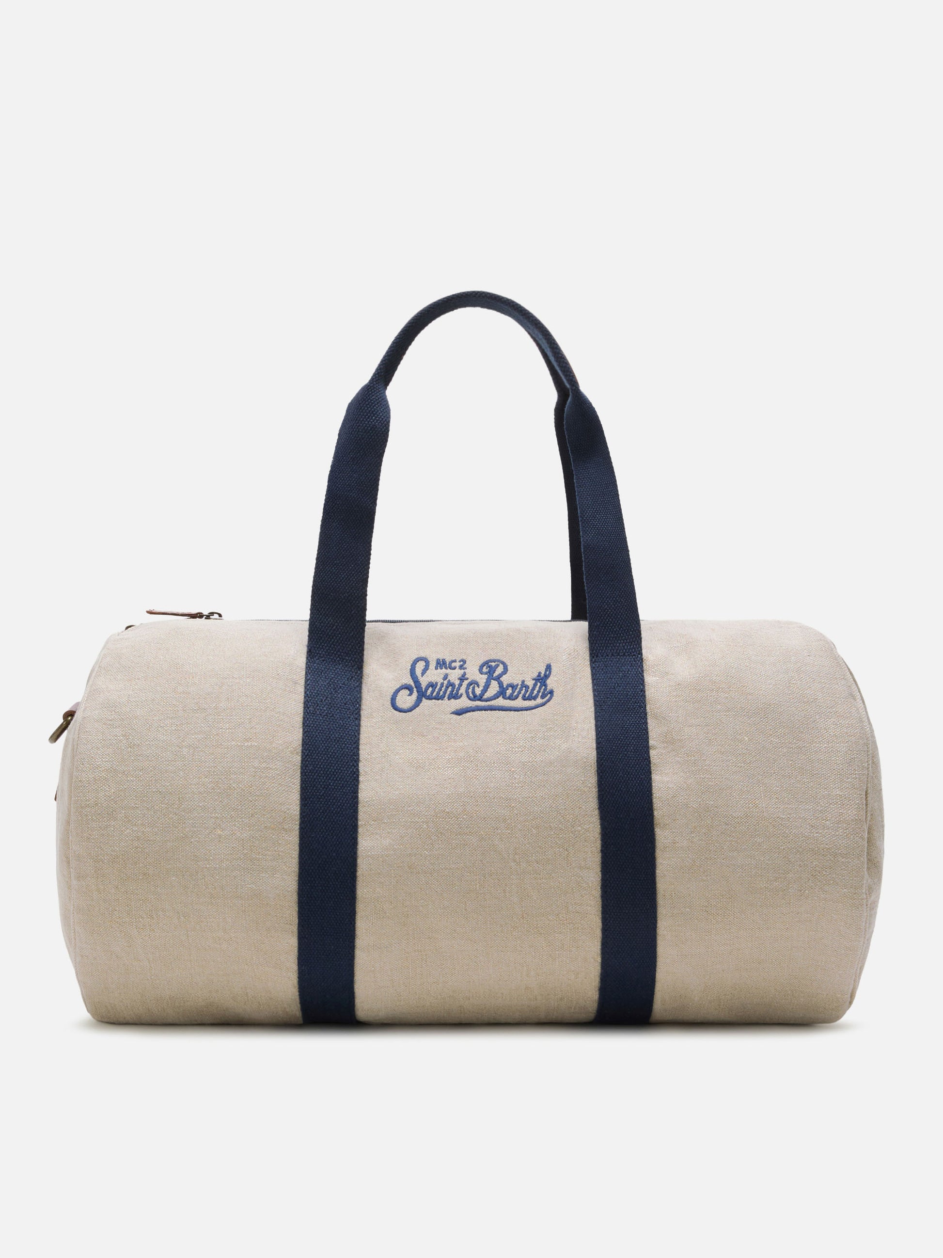 Round Jetleg beige linen weekender with contrasting embroidered logo