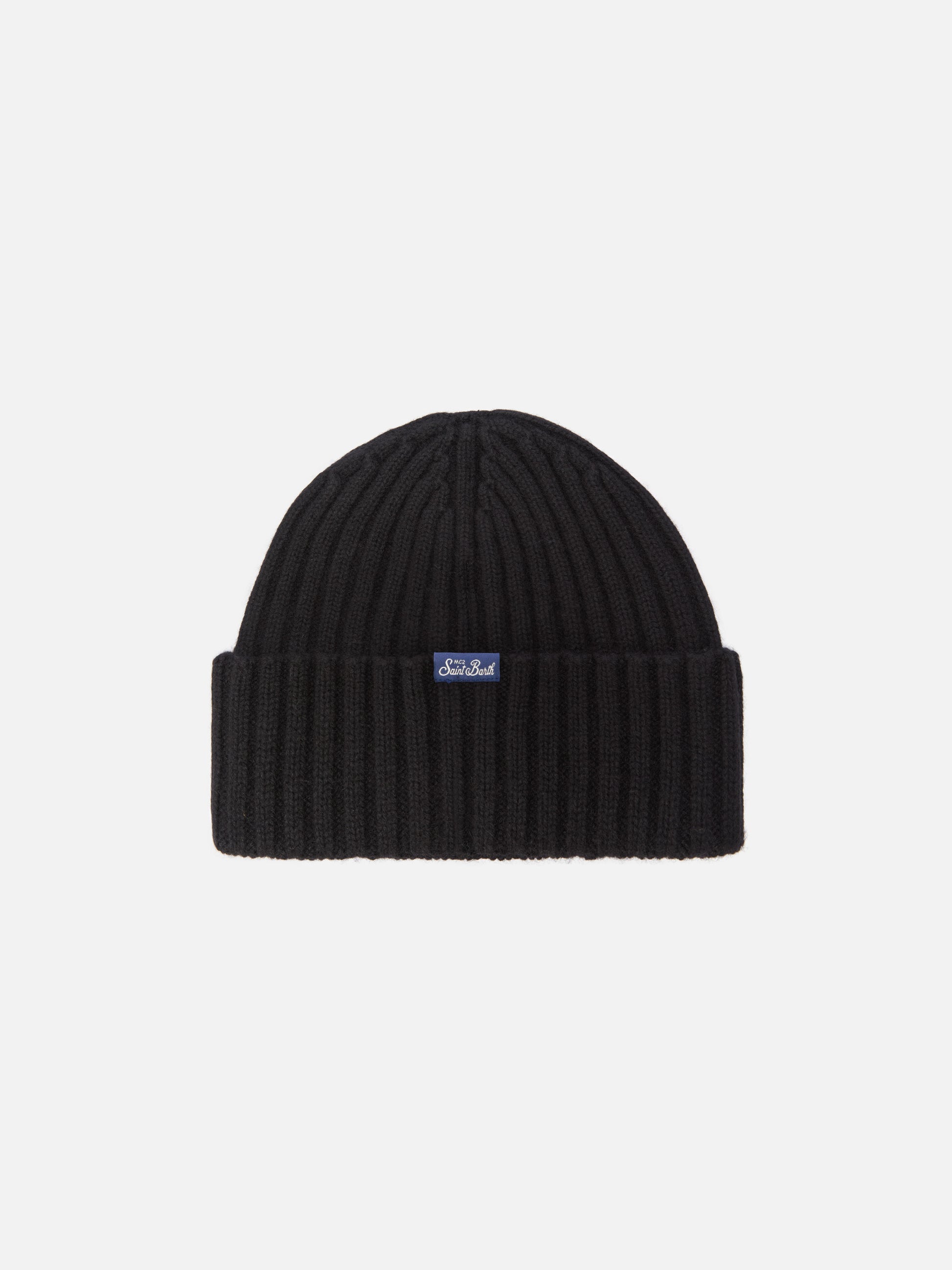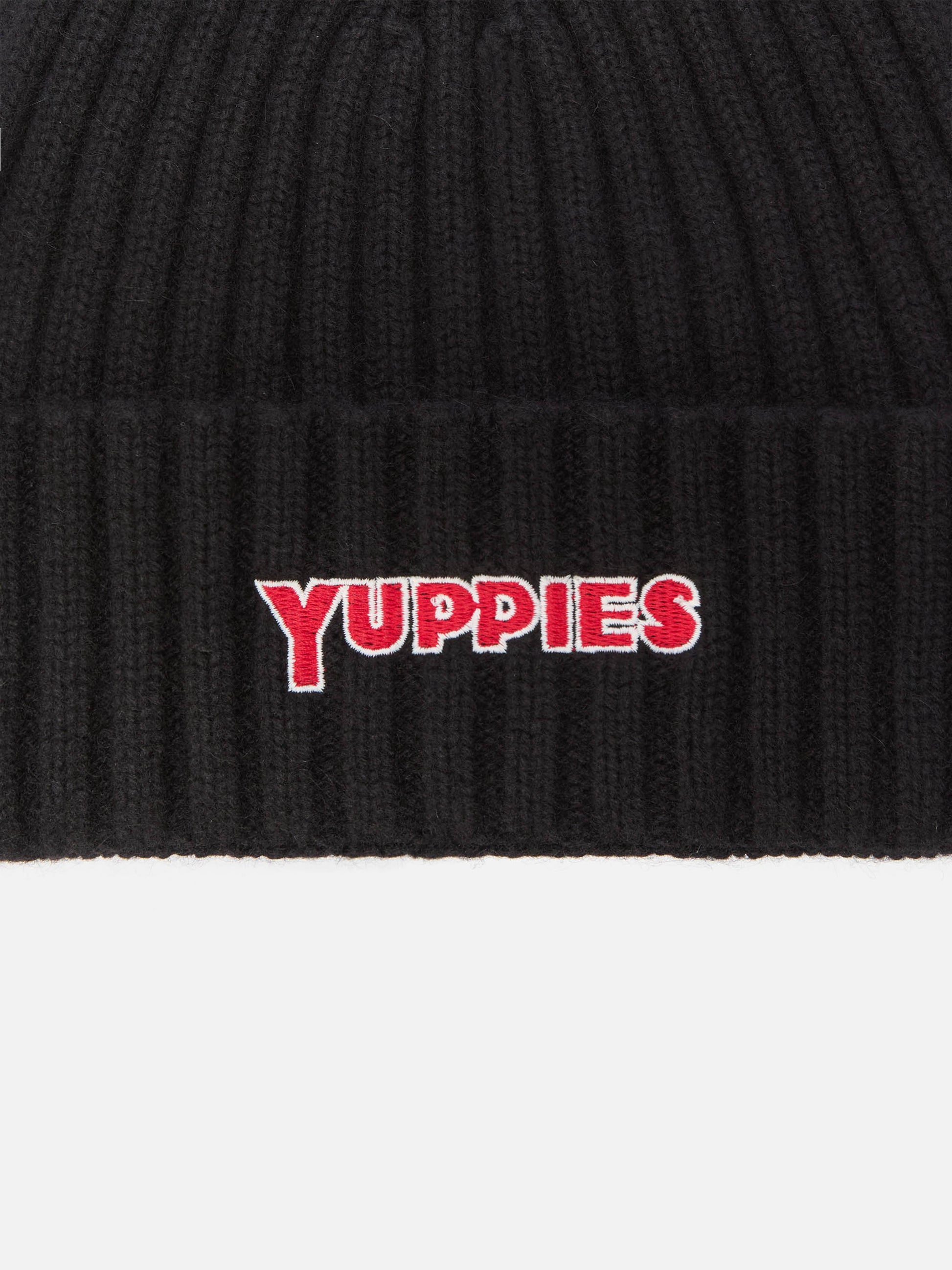 Wengen beanie in cashmere blend in black with Yuppies embroidery