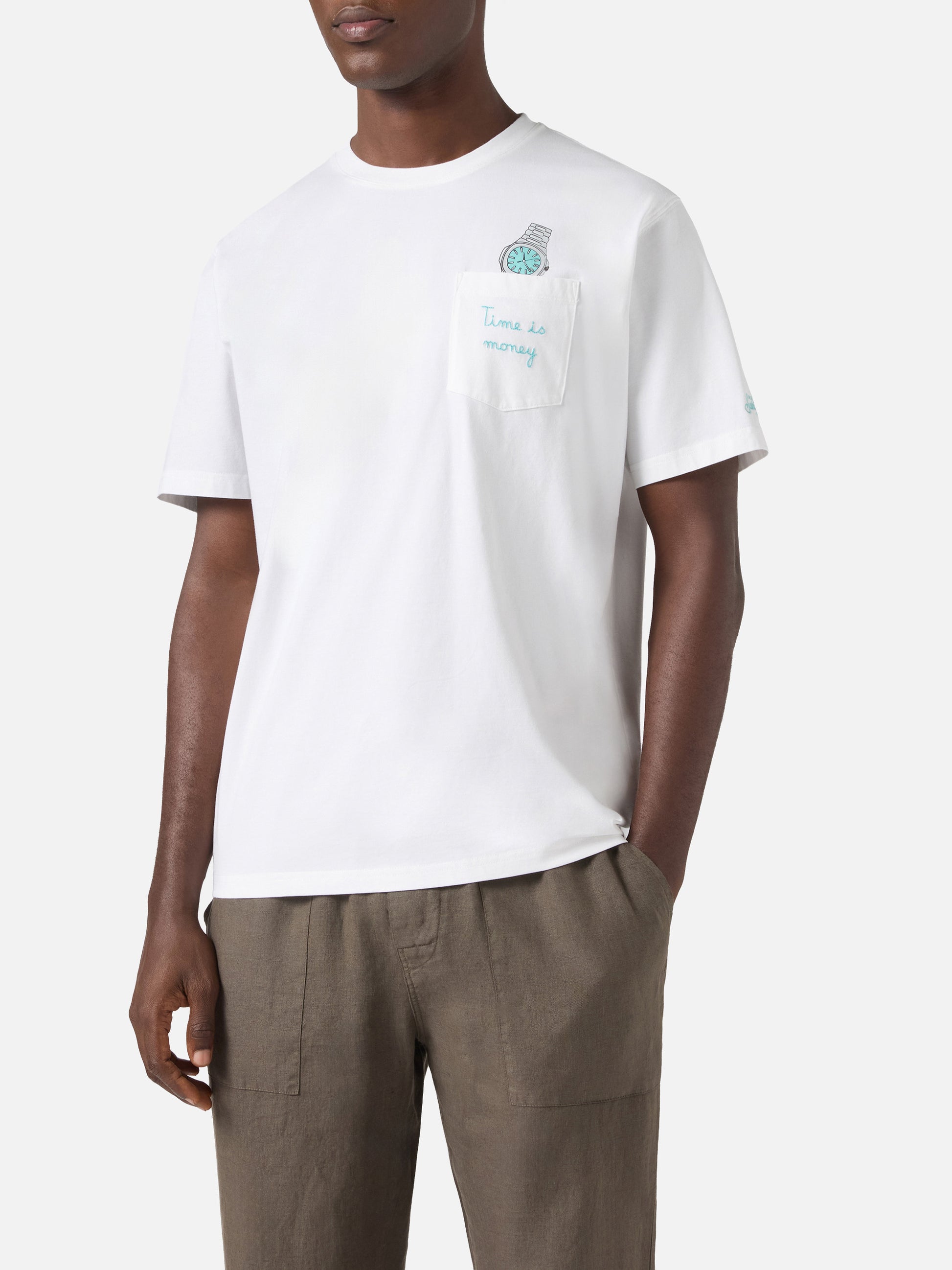White Austin t-shirt with watch and Time Is Money embroidery