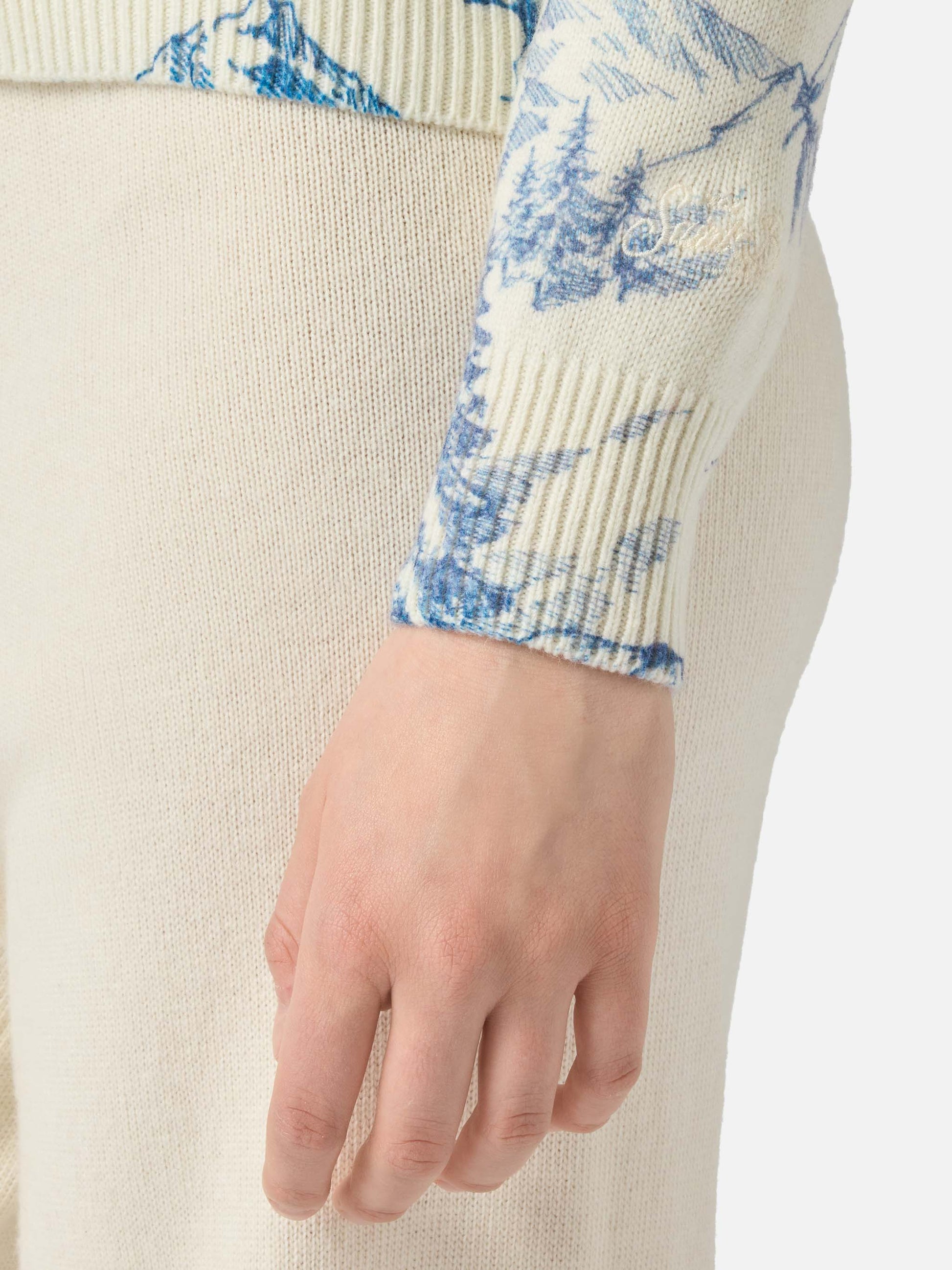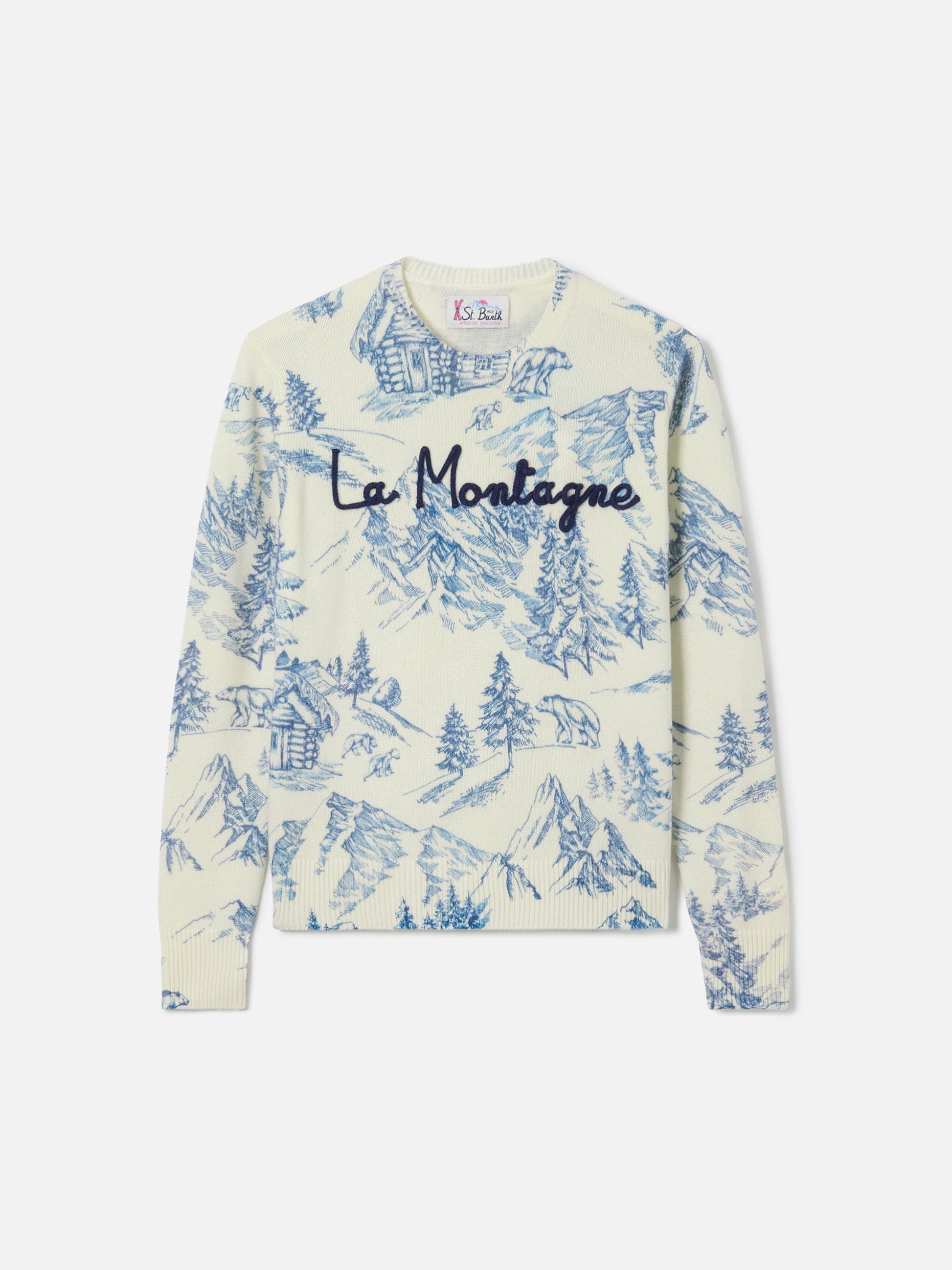 Weißer Damenpullover New Queen mit Toile de Jouy-Druck und La Montagne-Stickerei