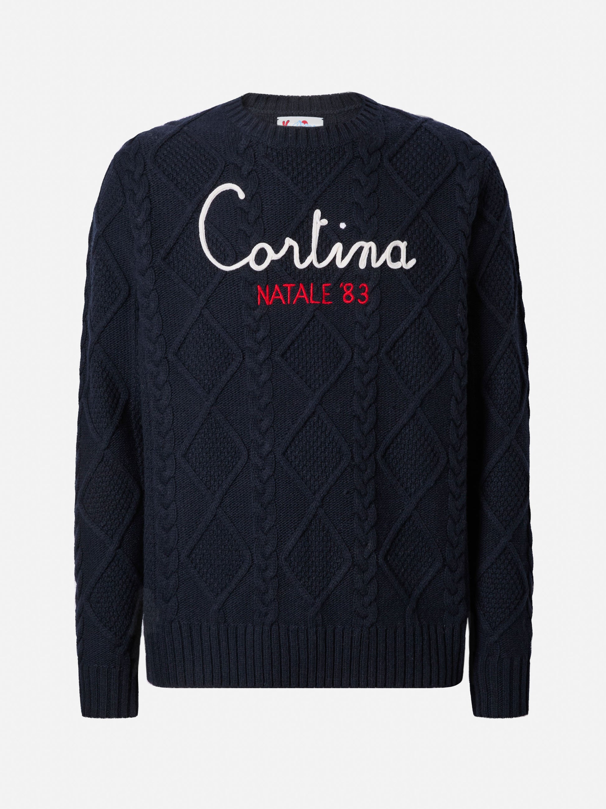 Maglione blu a girocollo Bergen Tricot con ricamo Cortina Natale '83