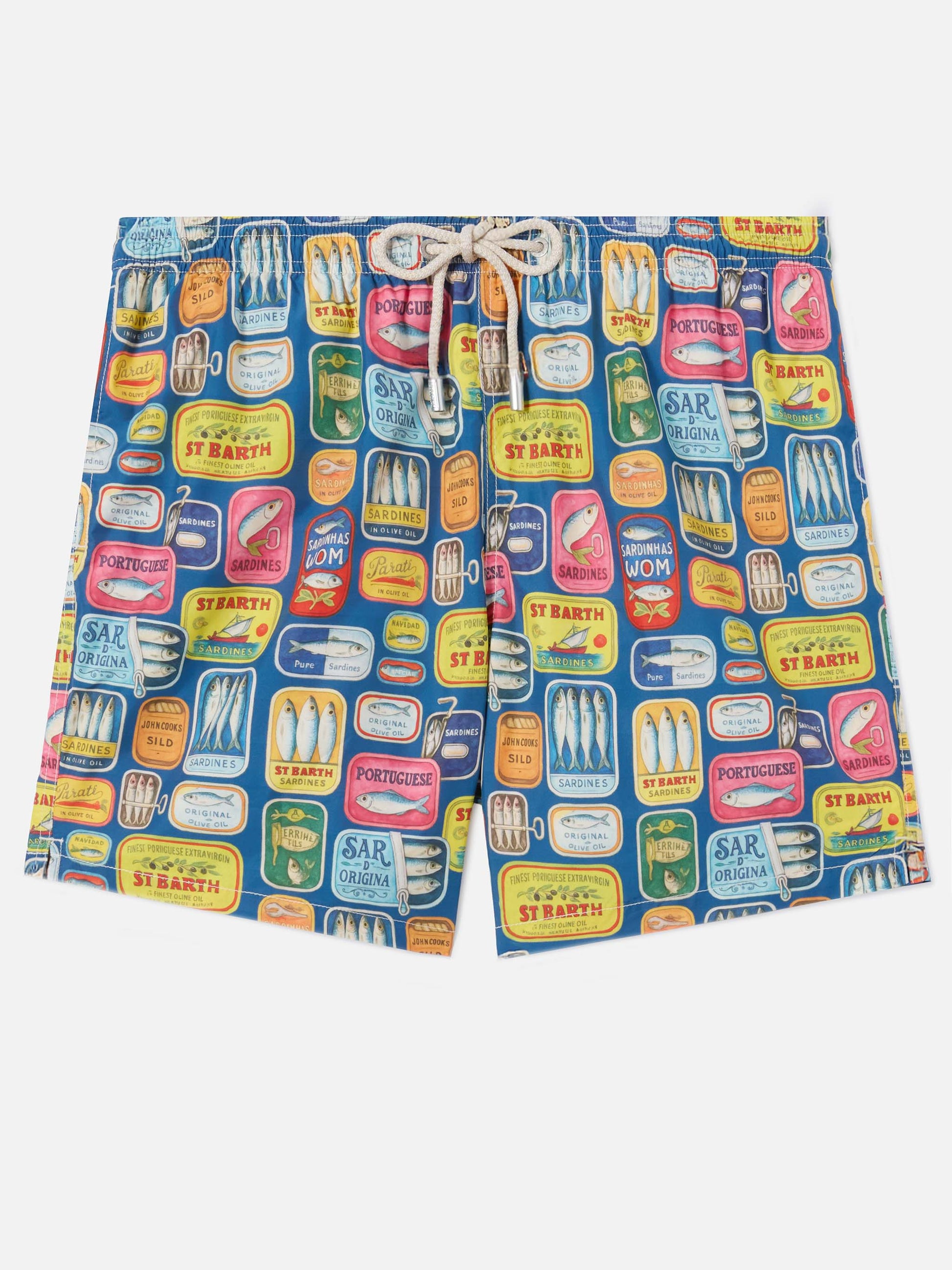 Costume mare Lighting blu con stampa lattine di sardine all-over