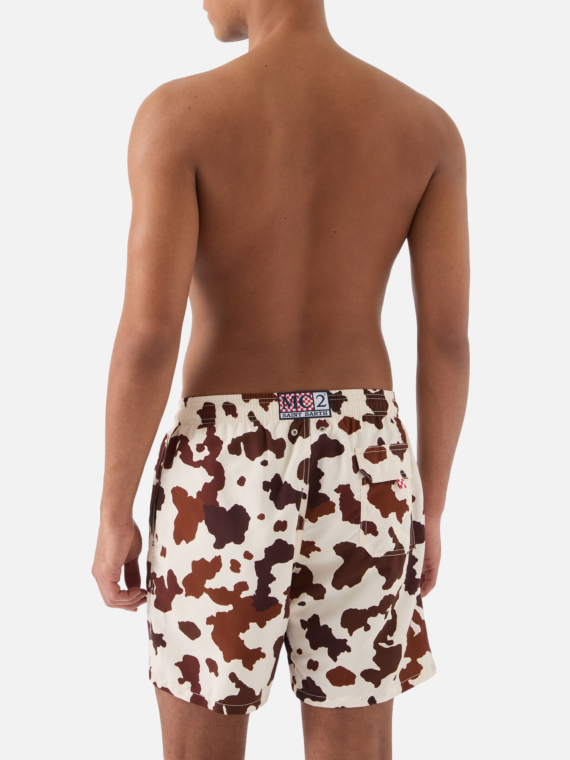 Il costume mare Gustavia è realizzato in tessuto leggero effetto mano pesca che garantisce comfort e una piacevole sensazione sulla pelle. La stampa muccata all-over nei toni del marrone e bianco dona al modello un carattere originale e distintivo. La vita elasticizzata con coulisse permette di regolare facilmente la vestibilità, mentre la costruzione con tasche laterali, tasca posteriore e retina interna elasticizzata antibatterica assicura praticità e comfort. Parte della capsule famiglia.