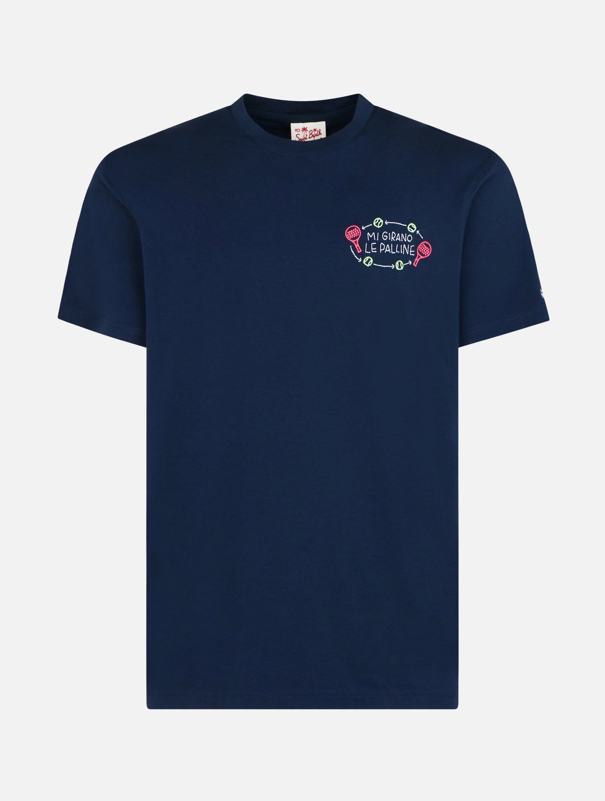 Vi presentiamo la t-shirt Portofino di MC2 Saint Barth. Questa maglietta a mezza manica da uomo è realizzata in tessuto jersey 100% COTONE ORGANICO, tinto in pezza per un look unico. Con un peso di 180 g, offre una comoda vestibilità regolare. Caratteristica di spicco è la collaborazione con Insulti Luminosi e i ricami posizionati sul punto del cuore, completati dal ricamo Saint Barth sul fondo della manica sinistra. Insulti Luminosi è un marchio italiano noto per le pionieristiche frasi LED dal sarcasmo irriverente, per poi espandersi in altri regni e gadget. Grazie a questa collaborazione gli Insulti Luminosi non sono solo luminosi; ora sono stati trasformati in disegni ricamati per magliette e altri accessori. T-shirt uomo in cotone biologico Portofino Tessuto tinta unita blu Ricamo multicolore sul petto a sinistra Mi girano le palline Tinto in pezza Girocollo Maniche corte Firma MC2 Saint Barth ricamata sulla manica sinistra Composizione: 100% cotone biologico. Vestibilità classica La taglia L ha una lunghezza di 72 cm con un incremento di 2 cm per taglia; una larghezza spalle di 48 cm con un incremento di 2 cm per taglia; e la misura del mezzo torace è di 56 cm con un incremento di 2,5 cm per taglia Il modello è alto 185 cm e indossa una taglia L