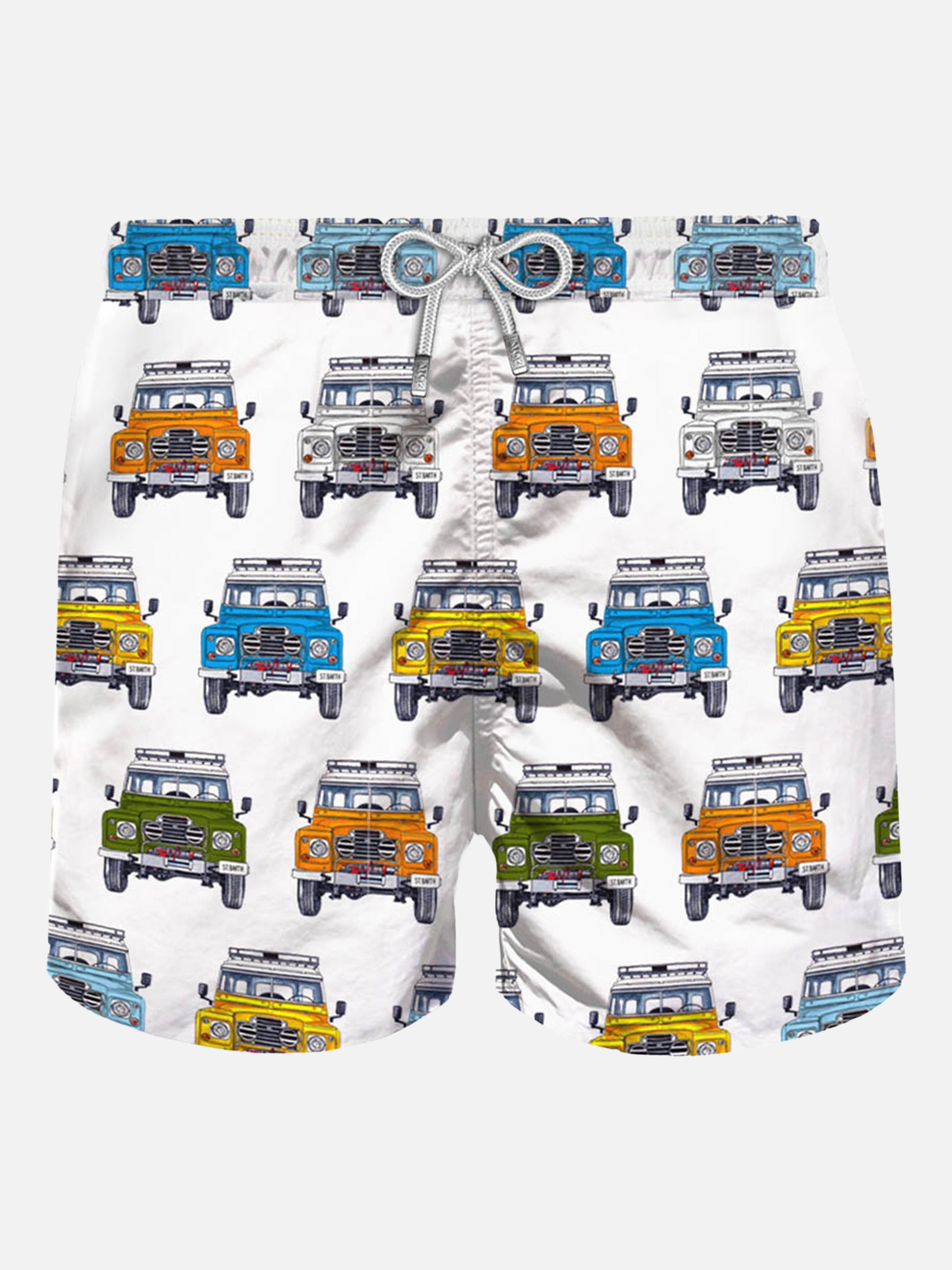 Safari cars over print, costume da bagno medio lunghezza, vestibilità regolare, con microfibra bianca, comoda coulisse in vita, slip interno ergonomico, tasche su entrambi i lati, tasca classica posteriore con chiusura a velcro.