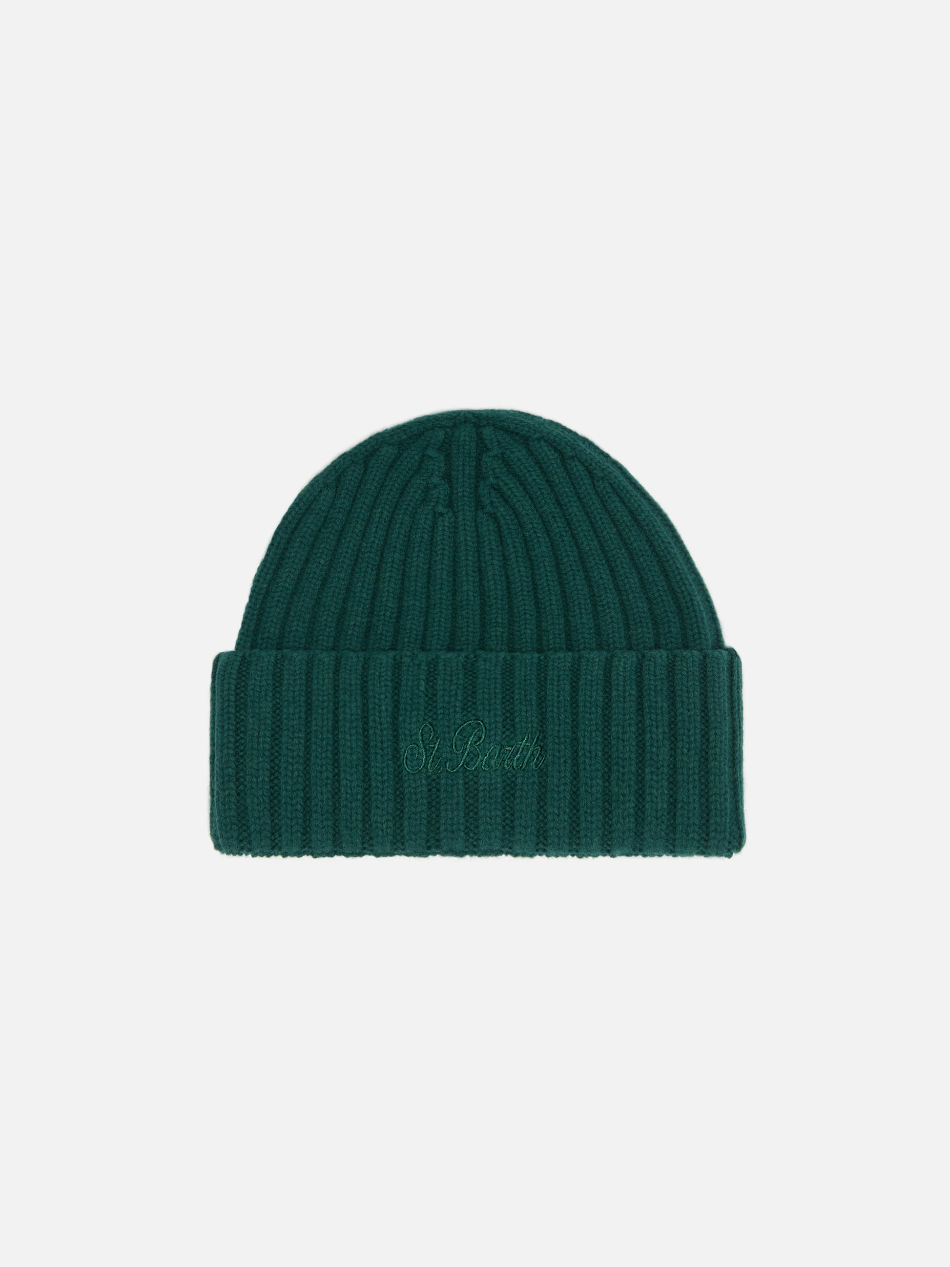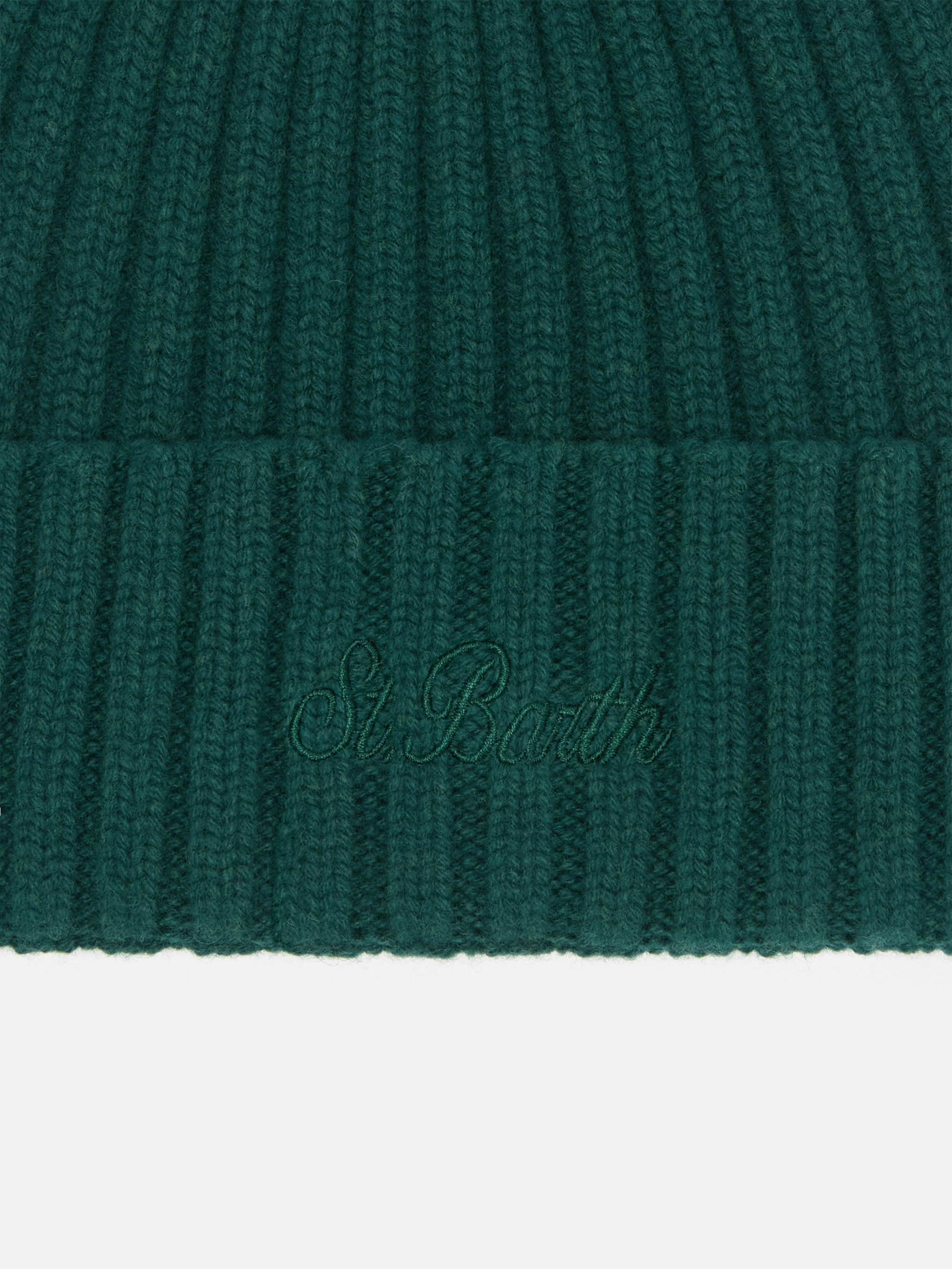 Berretto Wengen in lana verde inglese con ricamo St. Barth sul risvolto
