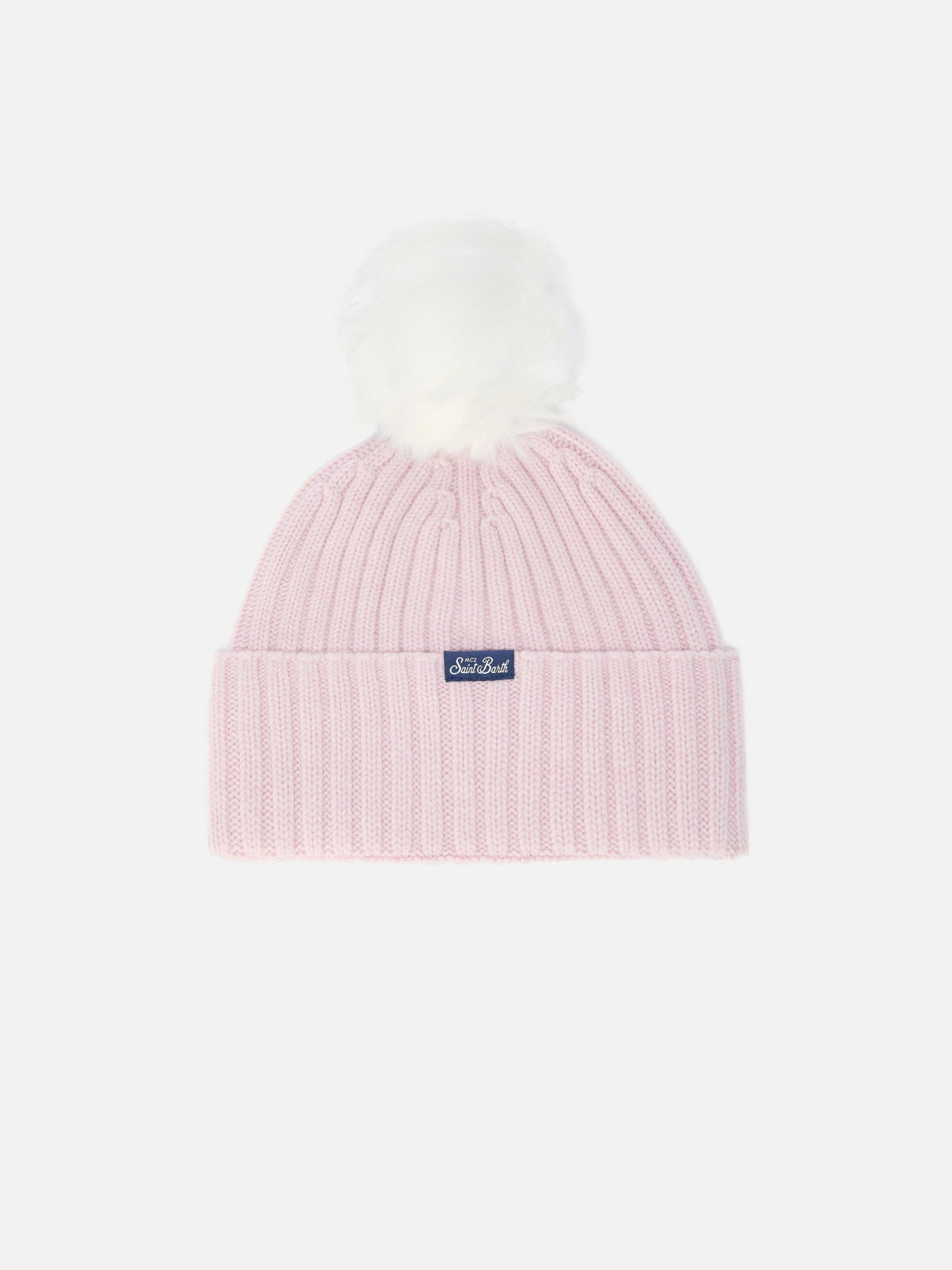 Berretto Wengen in misto cashmere con ricamo rosa Too Cool e pompon