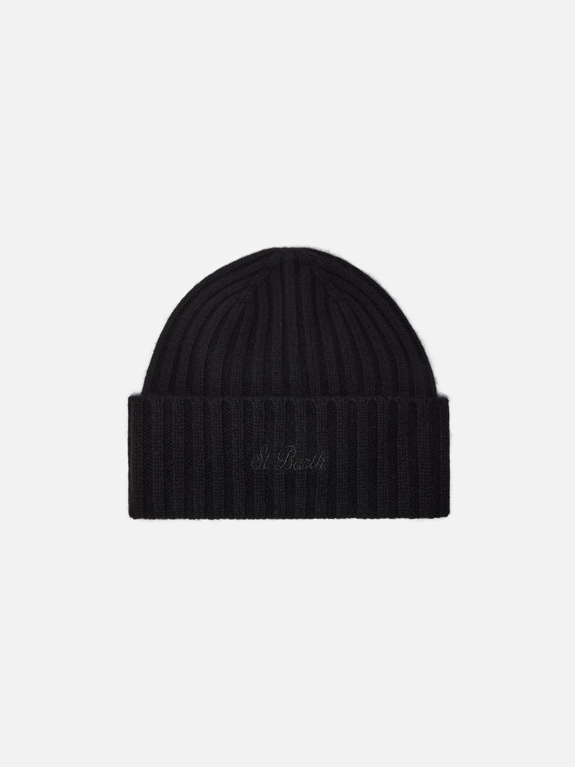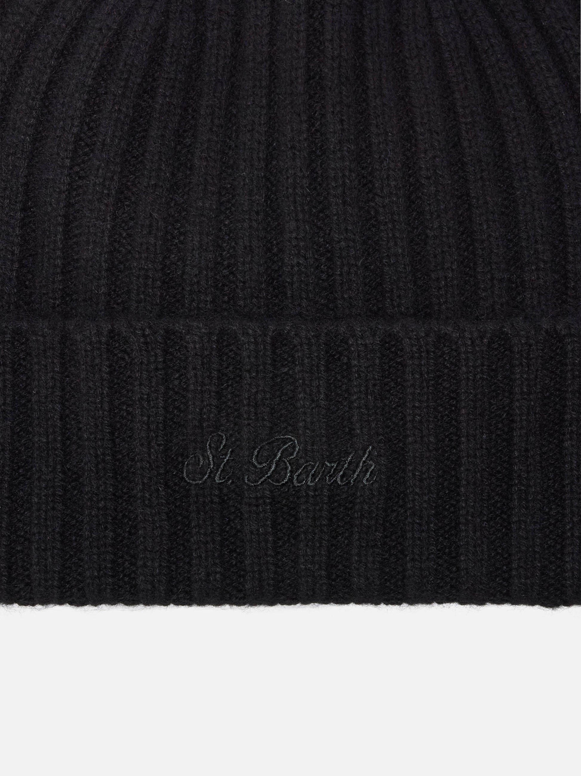 Berretto Wengen in cashmere nero con ricamo St. Barth sul risvolto