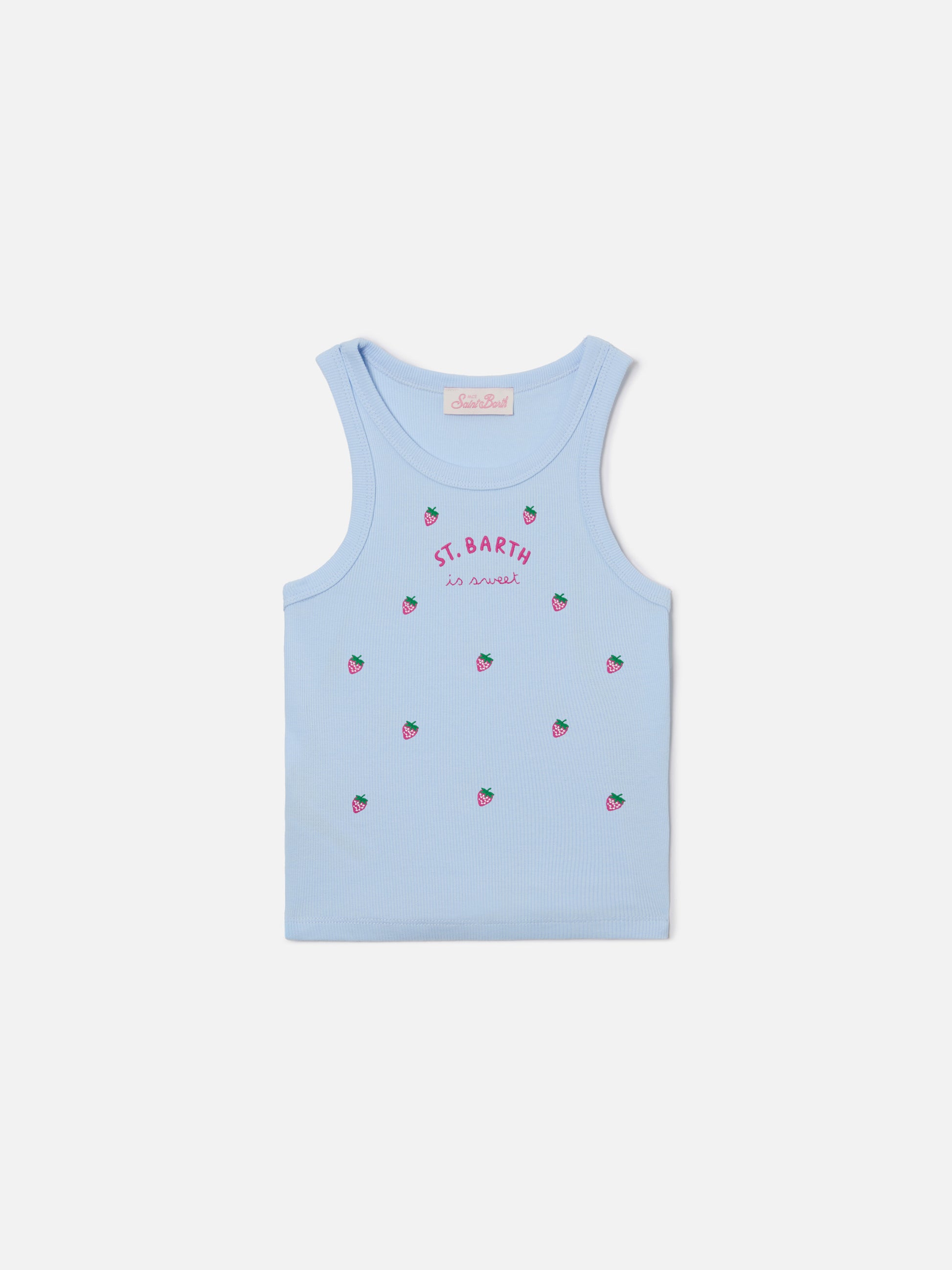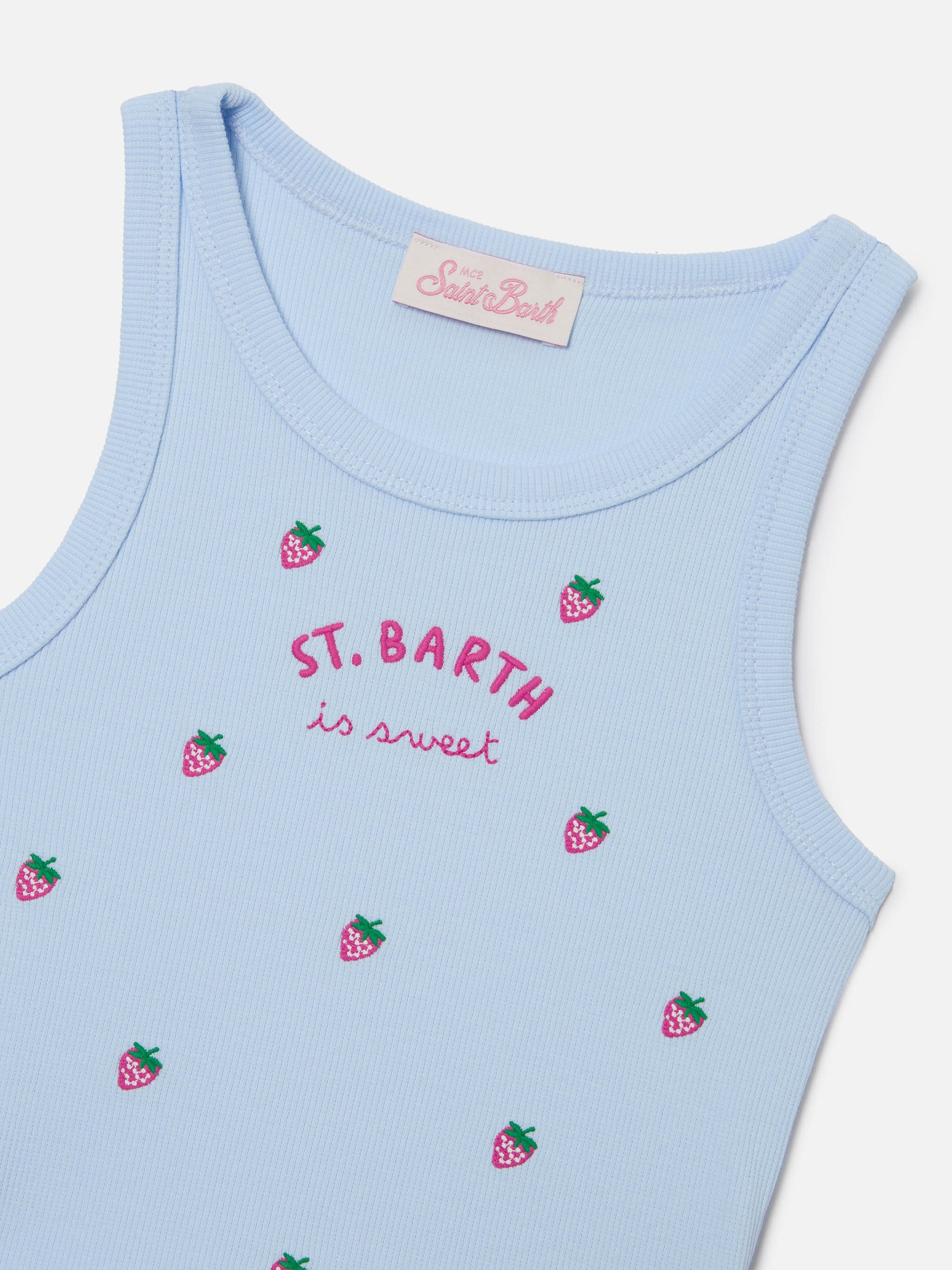 Blue Jr Tank-Top in light blue with St. Barth is sweet embroidery and strawberries