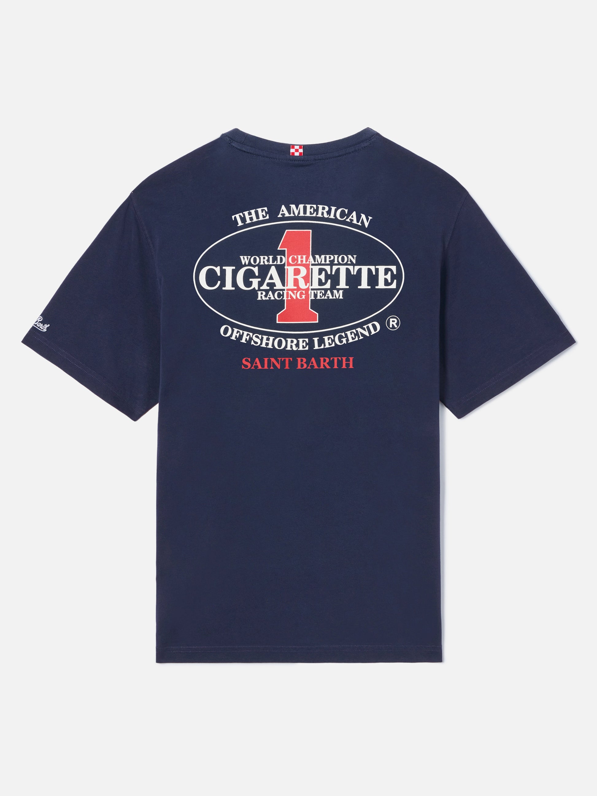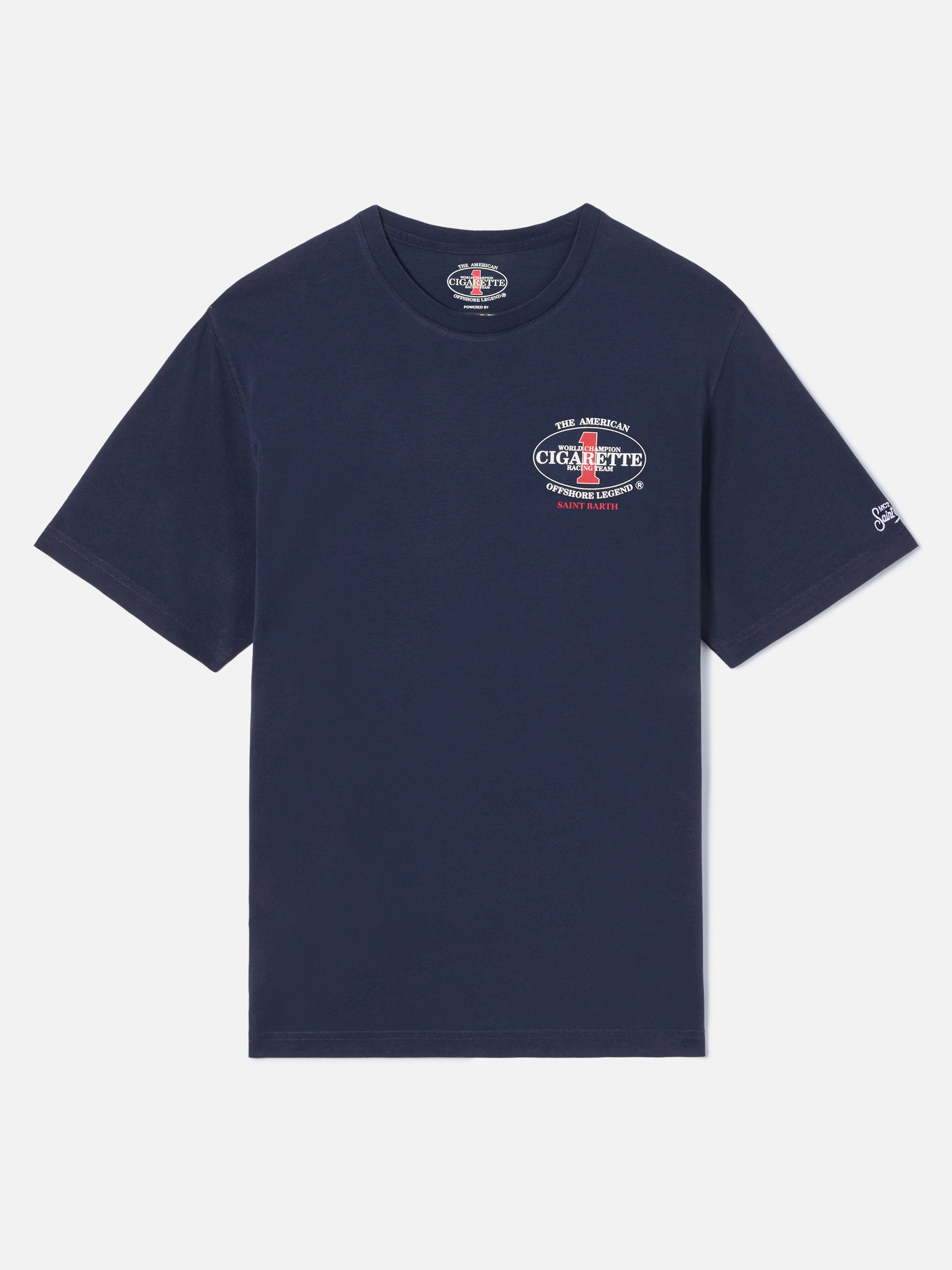 https://it.mc2saintbarth.com/products/blue-portland-t-shirt-with-cigarette-racing-print-special-edition10777980109146Blue Portland t-shirt with Cigarette Racing print | Special Edition105,00https:files/UID_PRL000207774L-MAN-T-SHIRT-BLUE-MC2-CIGARETTE-20260331134534_2.jpghttps:files/UID_PRL000207774L-MAN-T-SHIRT-BLUE-MC2-CIGARETTE-20260331134534_2.jpgEURInStockT-SHIRT650948215130All Products - Only Man649134276954AVADA - Best Sellers672847102298Cigarette673823621466Man Maxi Print T-shirts288164774072Man T-shirts673818575194Man t-shirts673853800794Men Prints and Embroidery654690484570UpSelling_Man_T-shirtsThe Portland t-shirt is crafted from pure cotton, designed to provide comfort and a natural feel against the skin. The solid blue design highlights the essential construction of the garment. In Cigarette Racing Special Edition, the style features a logo print on the chest, while the back is enriched with a large graphic featuring the Cigarette Racing Team logo and Offshore Legend Saint Barth lettering. The garment is completed with logo embroidery on the sleeve, a crew neck, short sleeves and a straight silhouette with regular fit.