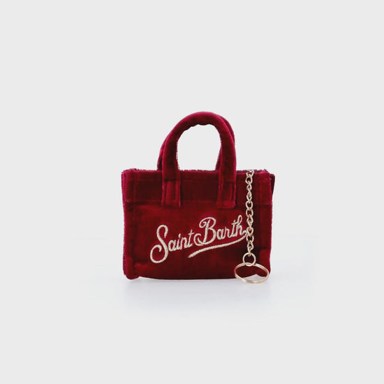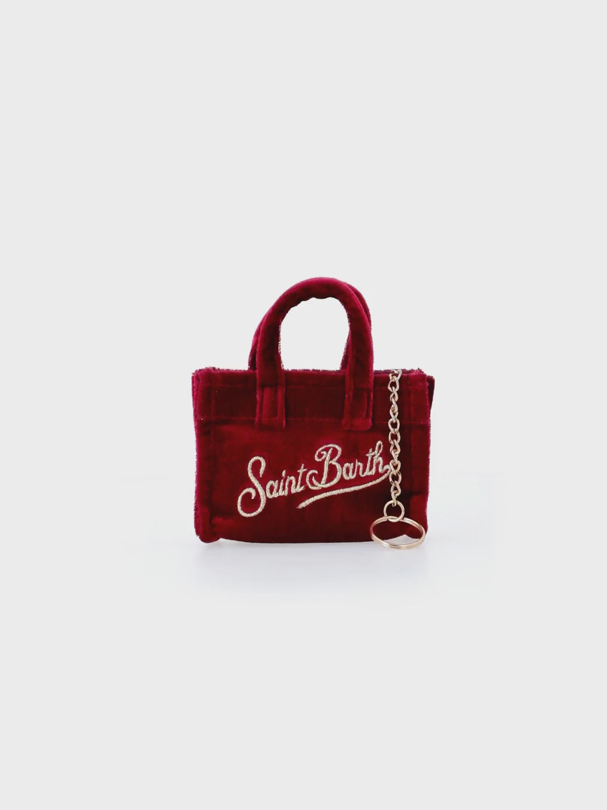 Introducing our Key Bag, a delightful accessory inspired by our Vanity design. Crafted from premium cotton canvas in a refreshing various shades and fabrics, this miniature key bag seamlessly merges comfort and elegance. The refined structure of the Key Bag strikes a perfect balance between practicality and stylish flair, making it a versatile and chic addition to your daily essentials. Measuring a compact 10 x 8 x 3.5 cm, the Key Bag is equipped with a key ring inside, providing a secure space for your keys. The bag features an exclusive Saint Barth logo print, adding a touch of sophistication to this functional accessory. With a zipper closure and an inner zipped pocket, this Key Bag ensures your keys are both stylishly stored and easily accessible. Available in an array of colors, the Key Bag allows you to express your unique style effortlessly. Elevate your accessory collection with this refined and versatile canvas key holder that seamlessly blends fashion and functionality. Key Bag Burgundy velvet fabric Exclusive Saint Barth logo embroidery Velcro closure Key ring inside With detachable shoulder strap Sizes: 10 x 8 x 3.5 cm