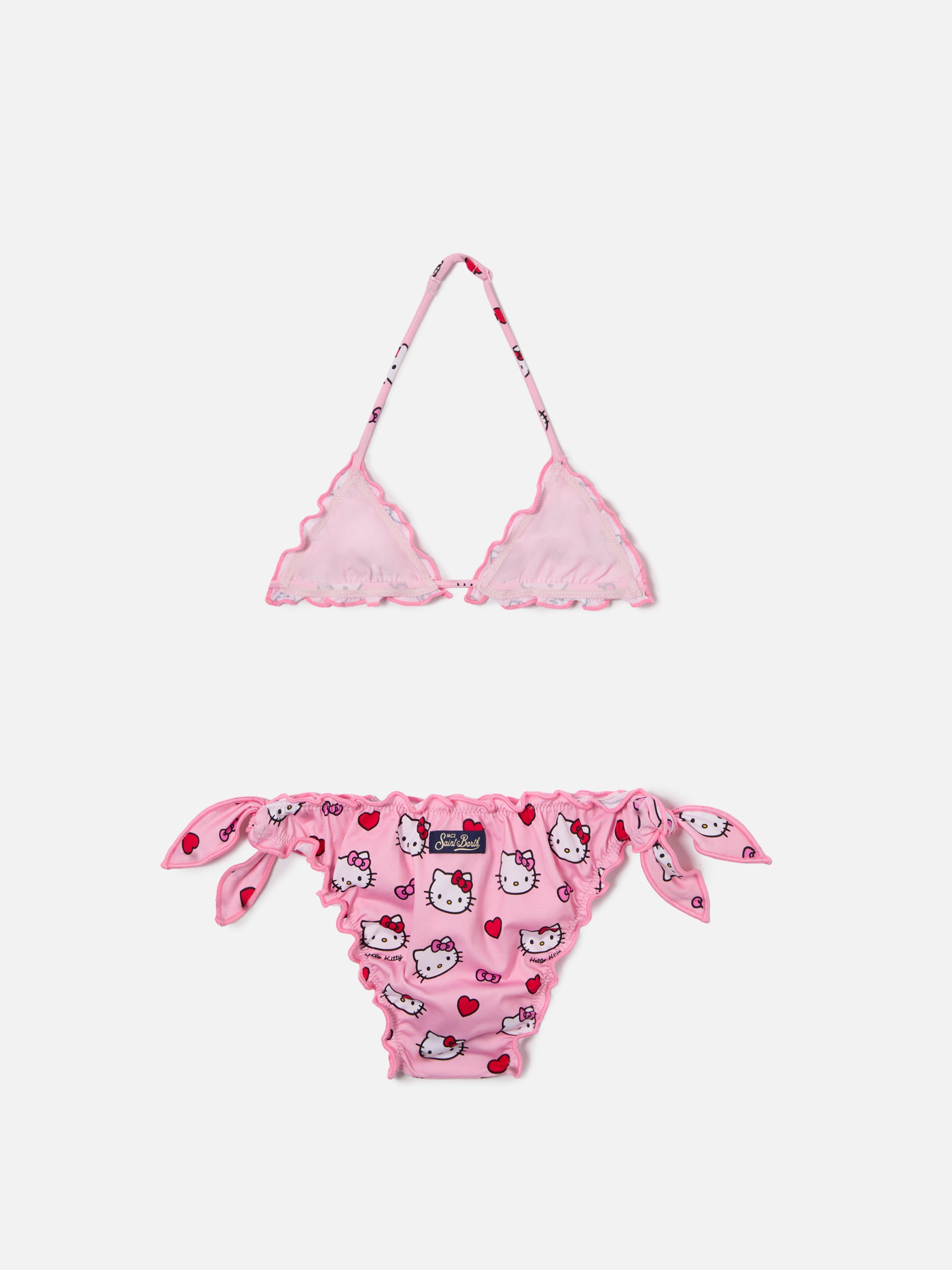 The Cris bikini in Special Edition Hello Kitty is crafted in stretch fabric with a pink base and features an all-over Hello Kitty print. This girls style includes a triangle top with adjustable ties and ruffled edges, paired with size-dependent bottoms construction. The swimsuit is lined and features a fitted silhouette.