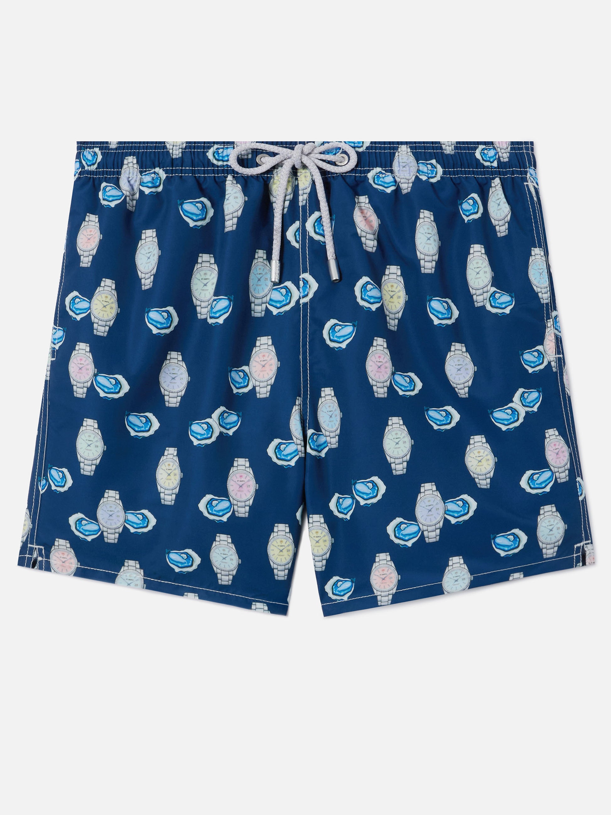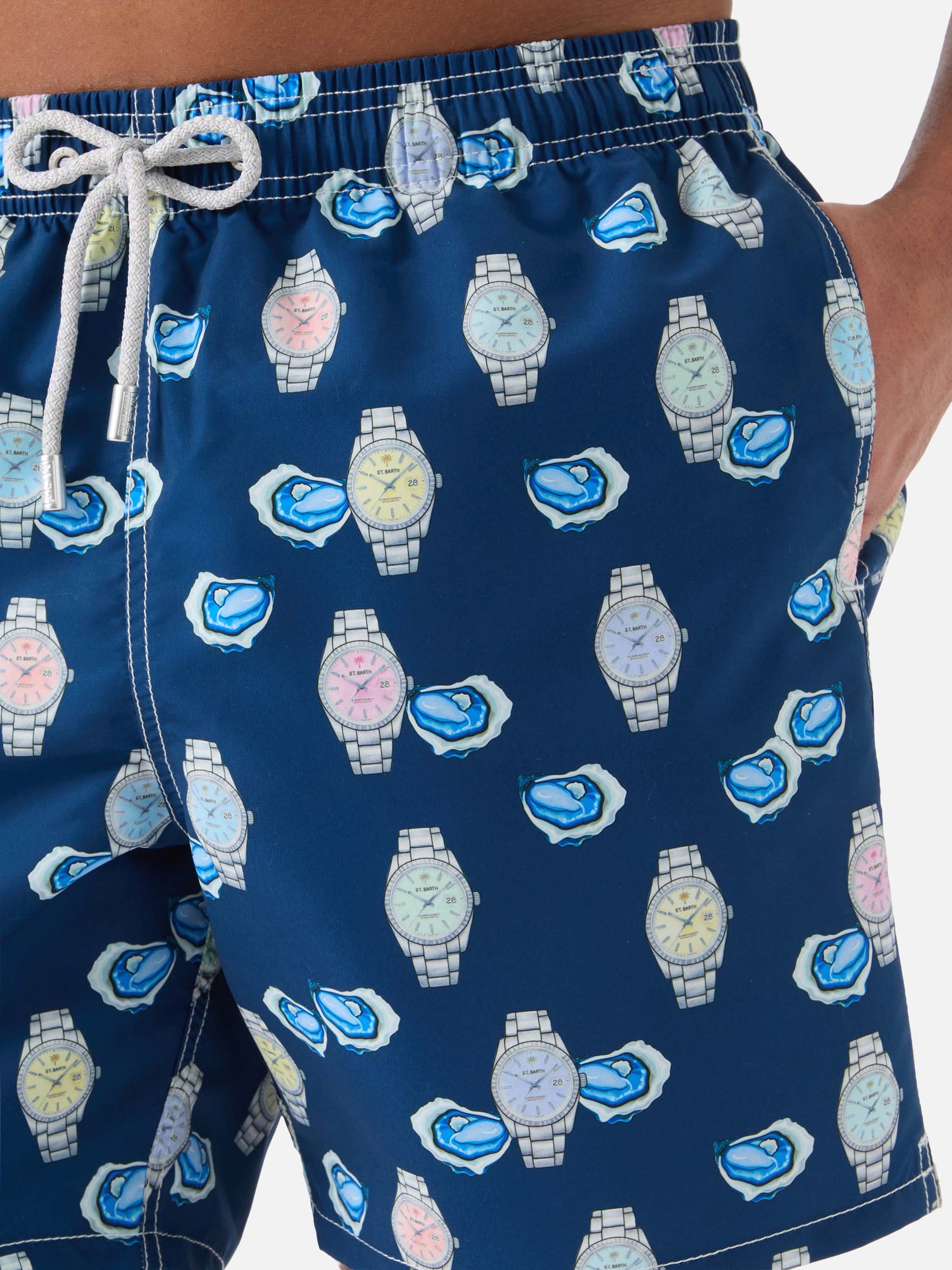 Gustavia swim shorts with oysters and watches print