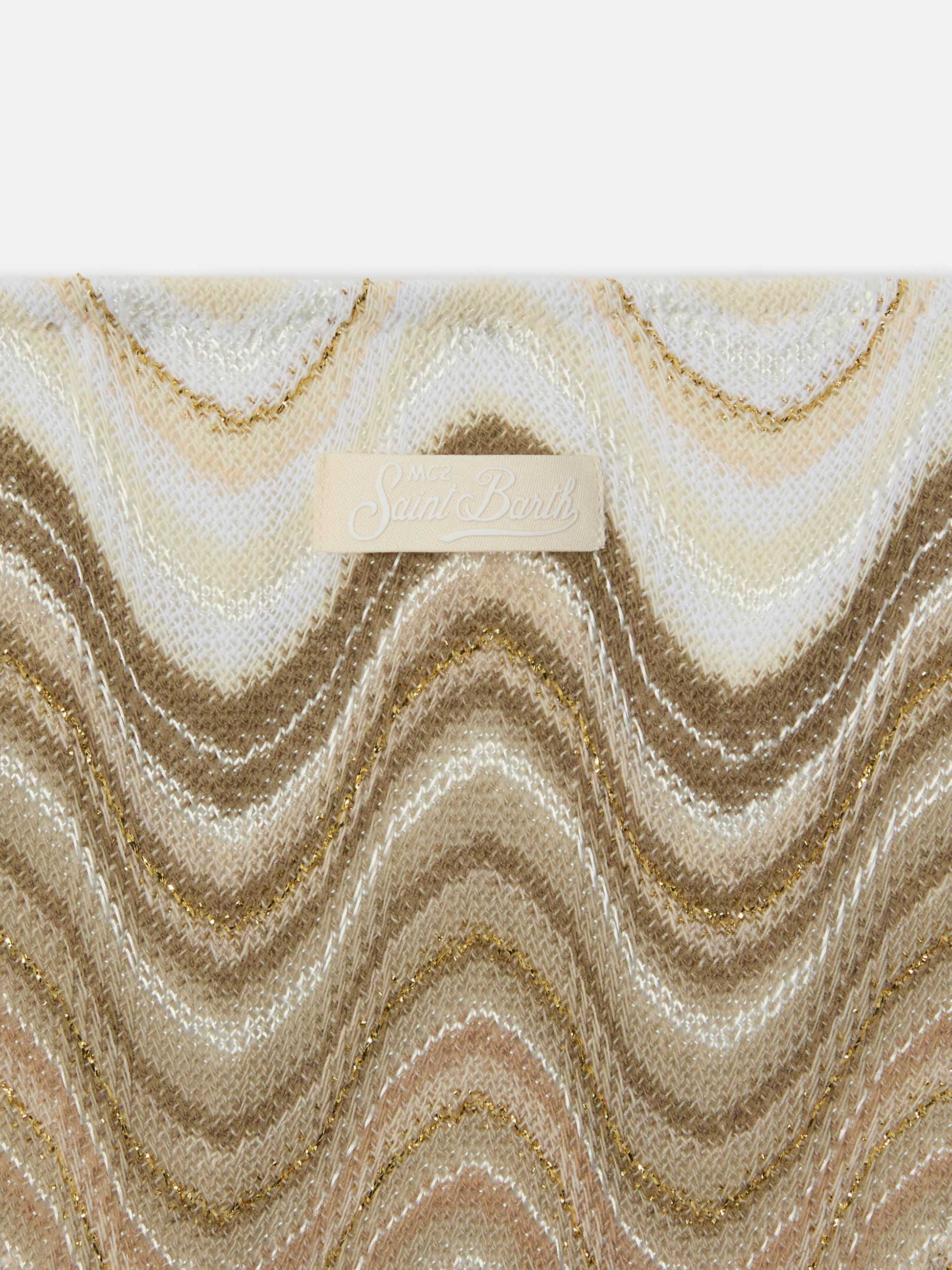 The Holly bikini is crafted from raschel fabric featuring horizontal wave motifs in shades of gold, beige and ivory. The knit construction made on raschel looms enhances the textured and slightly three-dimensional finish, highlighting the soft shaded pattern. It features a triangle top with adjustable tie straps, paired with bottoms designed with a size-differentiated construction. The garment is fully lined and offers a slim fit.