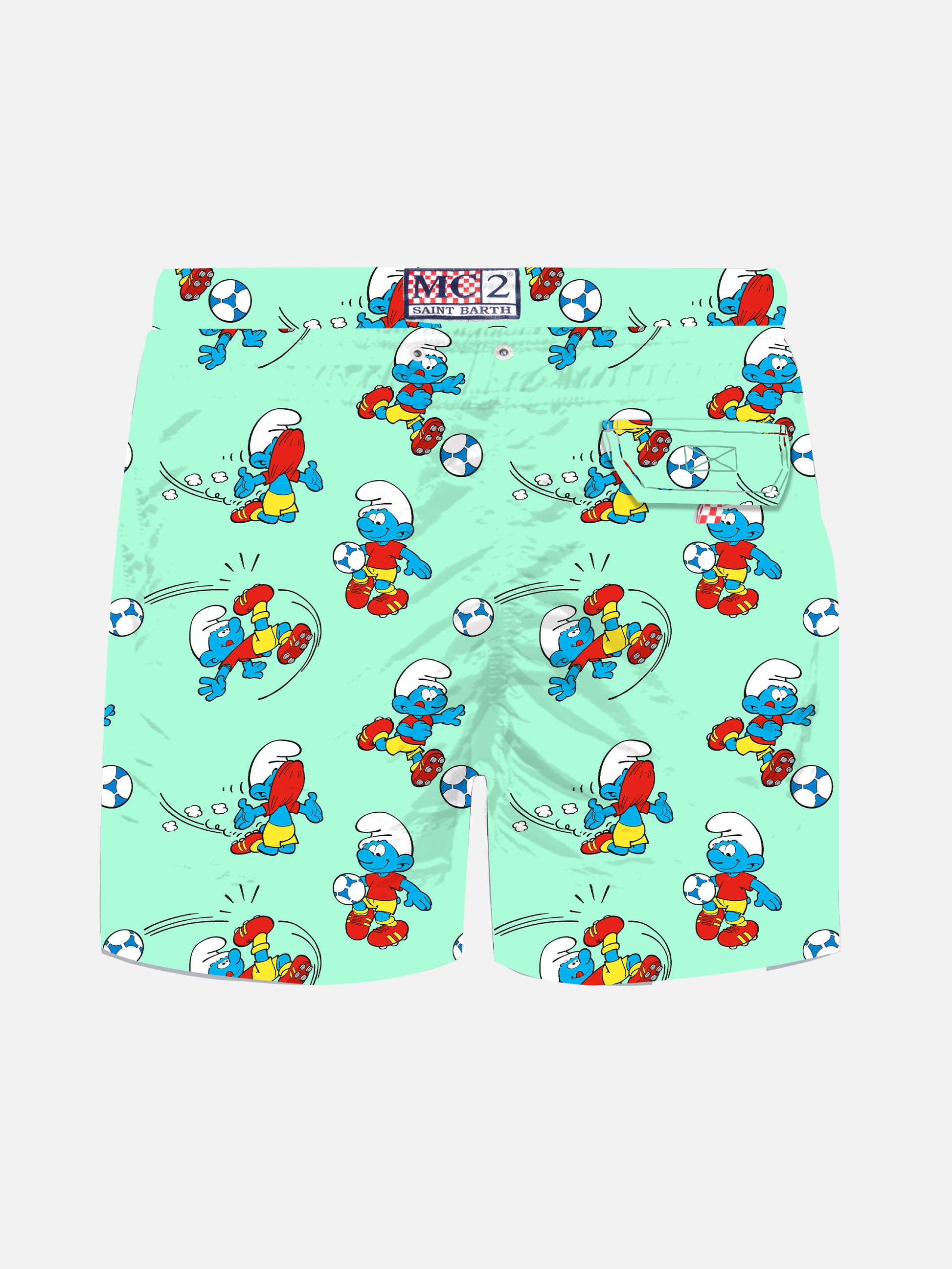 Jean Lighting mid-length swim shorts are the mini-me version of the Lighting model, designed for comfort and quick drying. Featuring an elasticized waistband, branded eyelets for water drainage, and practical pockets, they combine style and functionality. Made from 100% recycled polyester, they reflect MC2 Saint Barth's commitment to sustainability. Boy Jean Lighting mid-length swim shorts Lightweight fabric Quick drying Smurf all-over print Green backcloth Comfortable elasticized waistband Adjustable drawcord with branded terminals Inner mesh lining Side pockets with French seams Back patch pocket with magnetic closure Branded eyelets designed to drain water and prevent ballooning effect MC2 Saint Barth exclusive label on the back Classic fit Composition: 100% recycled polyester Size 6 yrs has a half waistband width of 36 cm (stretched) and varies by 1,5/3 cm for each size, depending on the size; side length including waistband 23 cm and varies by 1,5/3 cm for each size, depending on the size Please note that all measurements provided are approximate and subject to a tolerance of 1-2 cm due to manual measurement. This tolerance range is normal and should be expected. Care Instructions: cold wash by running water and neutral soap. Hang to dry .Do not leave to soak and do not dry in contact with other clothing. Do not leave the garment wet in contact with other clothing.