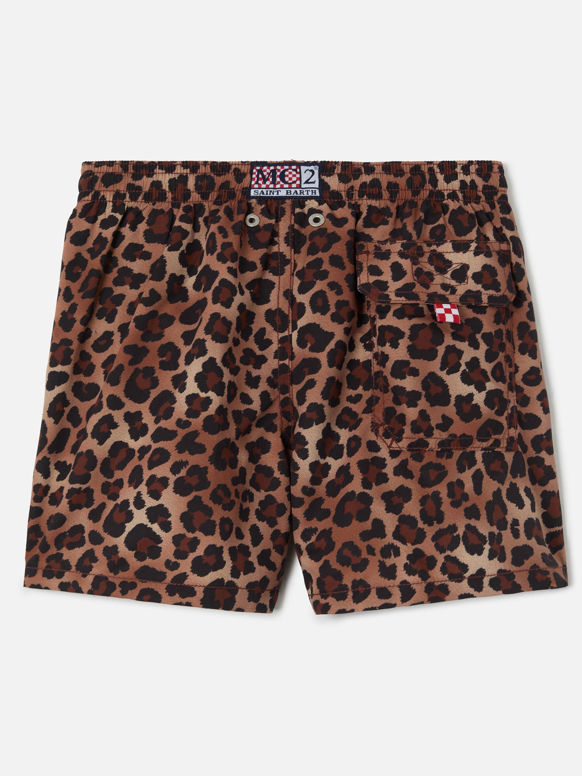 The Jean swim shorts are designed to provide comfort and ease during summer days. The elasticated waistband with adjustable drawstring ensures a comfortable fit, while the elastic inner mesh provides support and freedom of movement. The design features the Leopard Animalier print in beige and brown tones, creating a bold and contemporary look.