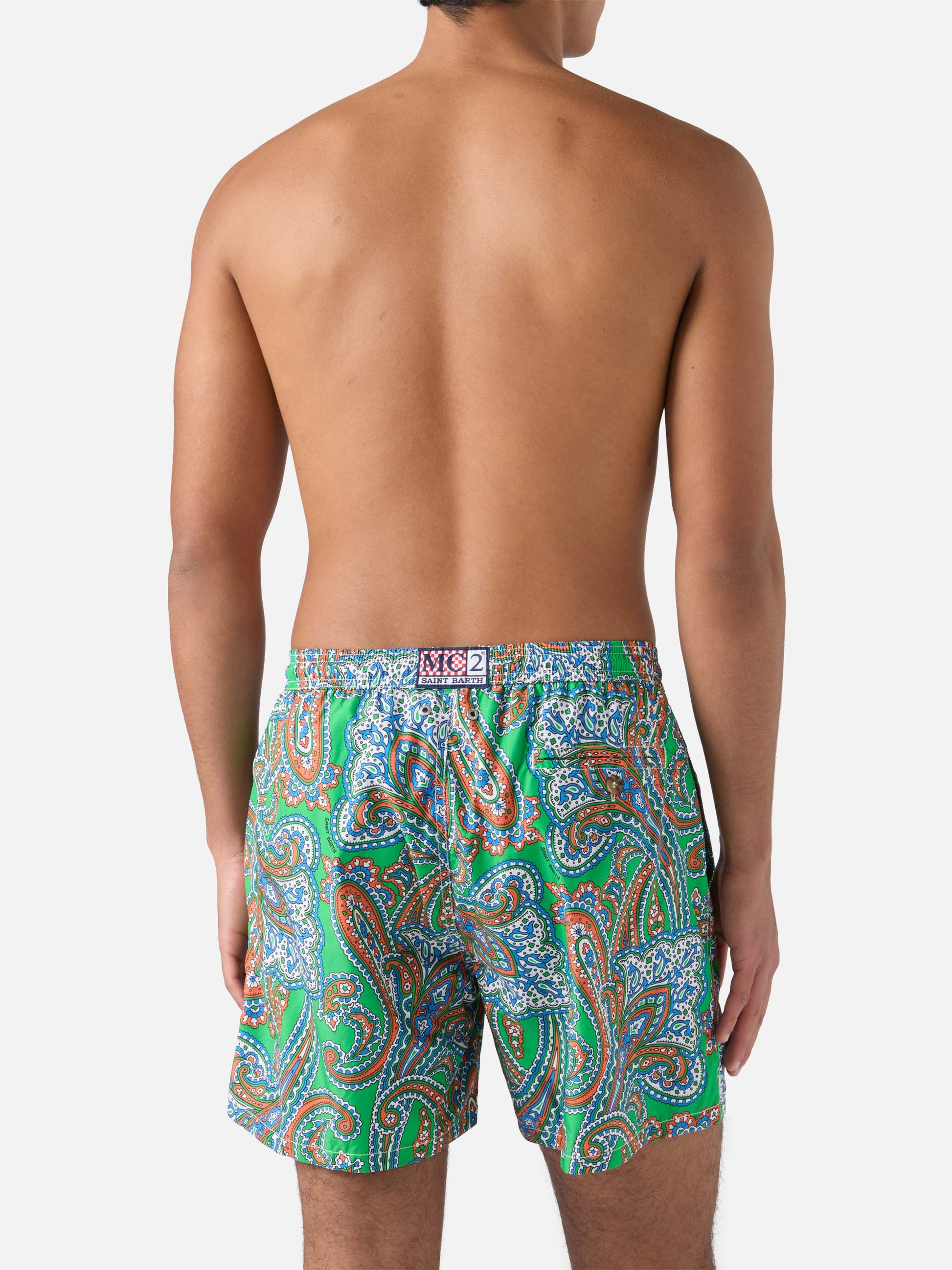 Details: Man Lighting mid-length swim shorts Lightweight fabric Quick drying Paisley all-over print Green backcloth Comfortable elasticized waistband Adjustable drawcord Inner mesh lining Side pockets with French seams Back patch pocket with button closure Branded eyelets designed to drain water and prevent ballooning effect MC2 Saint Barth exclusive label on the back Classic fit Composition: 100% recycled polyester Size L has a half waistband width of 52,5 cm (stretched) and varies by 2 cm for each size; side length including waistband 39,5 cm and varies by 1 or 1,5 cm for each size, depending on the size Please note that all measurements provided are approximate and subject to a tolerance of 1-2 cm due to manual measurement. This tolerance range is normal and should be expected. Model is 185 cm and wears a size large Care Instructions: cold wash by running water and neutral soap. Hang to dry. Do not leave to soak and do not dry in contact with other clothing. Do not leave the garment wet in contact with other clothing.