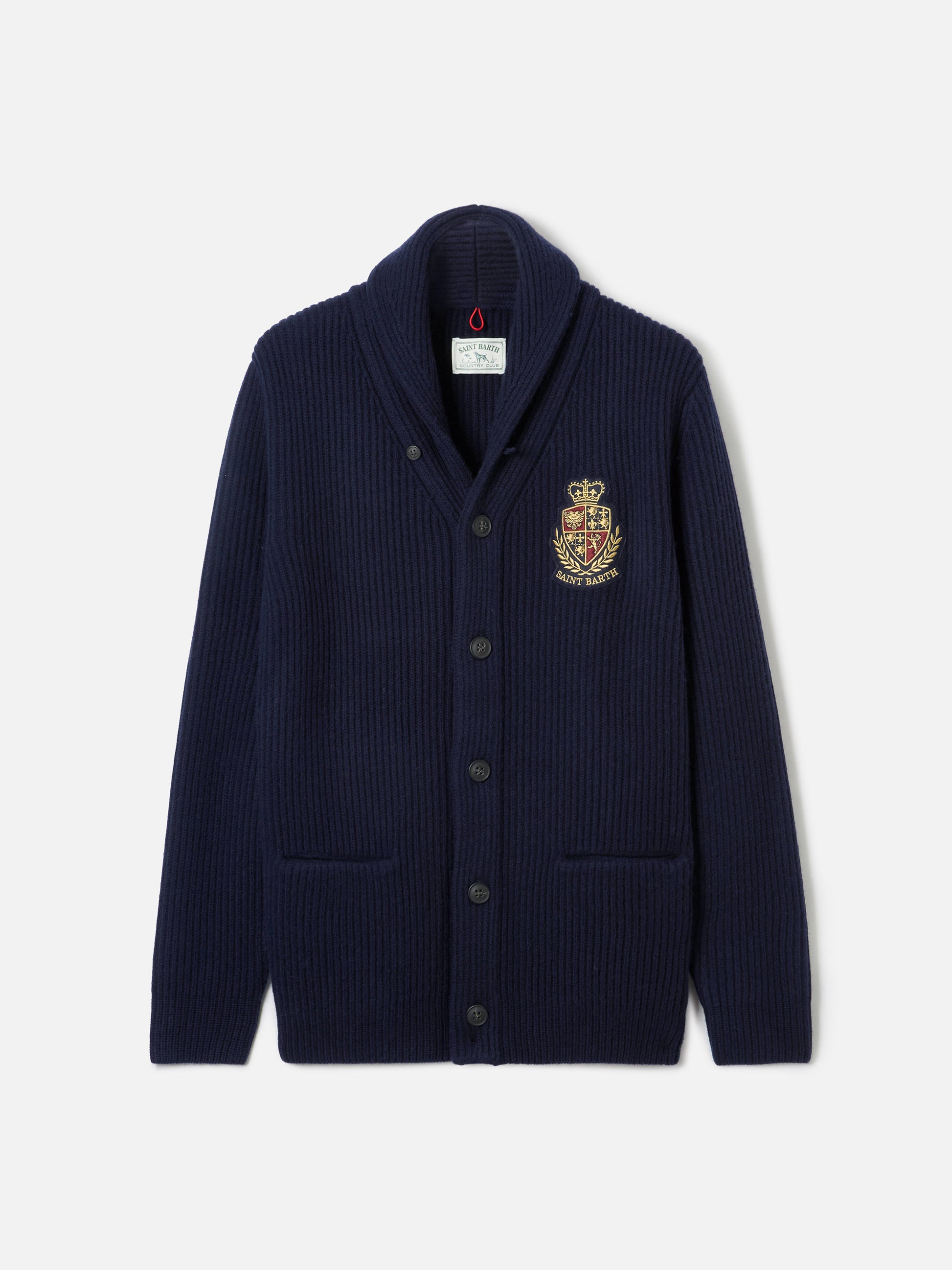 Man shawl collar blue ribbed cardigan with pockets and patch