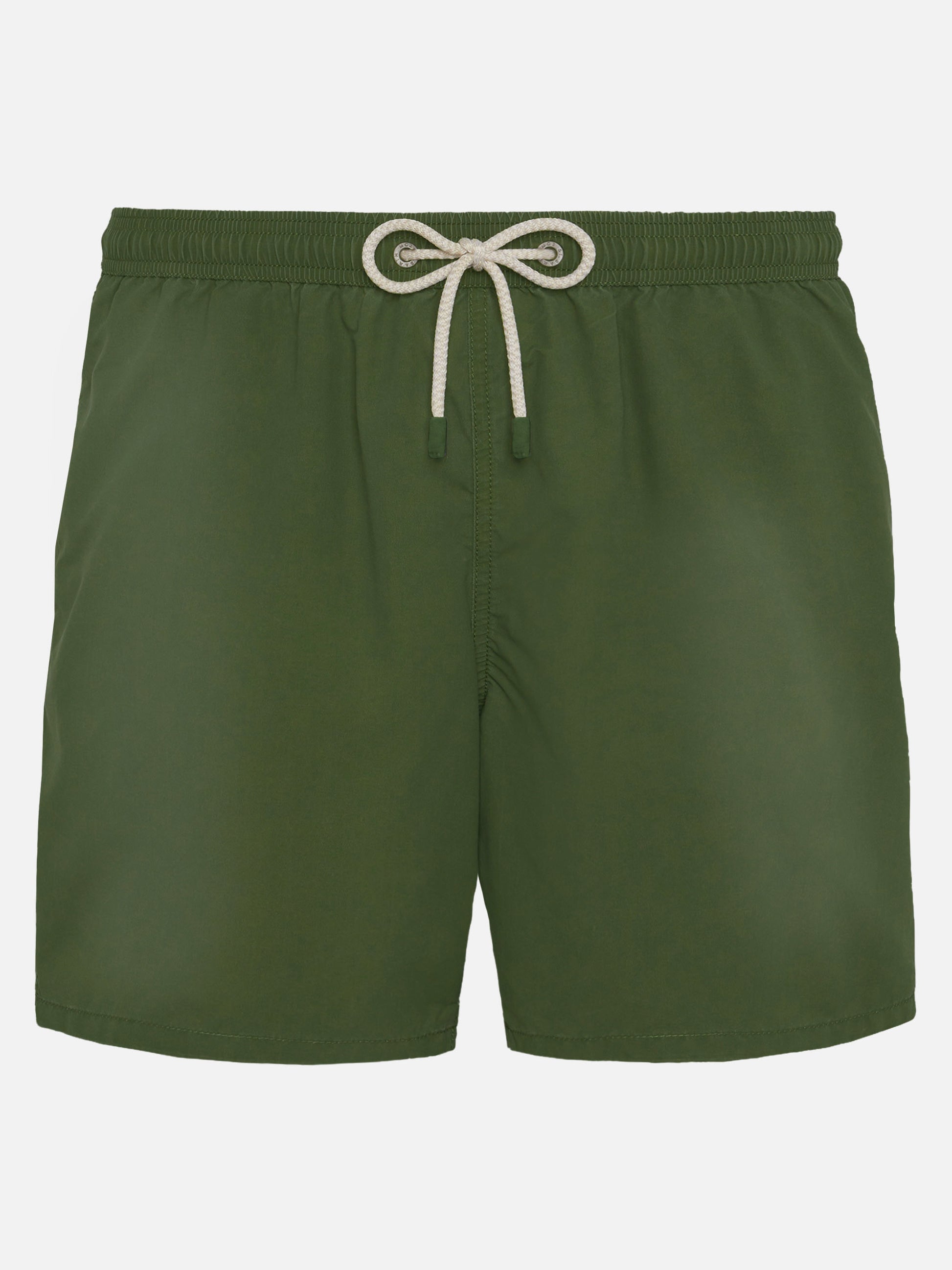 Introducing our Patmos swim shorts, crafted from textured polyester fabric, offering a cotton-like touch. Enhanced with contrast stitching and drawstring, as well as the embroidered exclusive Saint Barth logo detail at the bottom leg. Features a back pocket with flap and velcro closure. This version is made from fast-drying fabric. The beauty of this garment lies in the unique fabric processing technique, which begins with an initial fabric plating, followed by a gentle washing treatment once the garment is made. This process creates a one-of-a-kind vintage effect, particularly in the stitching. Every imperfection is considered a feature, making each piece truly unique. Man Patmos mid-length swim shorts Vintage military green color Texturized cotton touch Exclusive Saint Barth logo detail at the bottom leg Comfortable elasticized waistband Adjustable drawcord with branded terminals Antibacterial inner mesh lining Side pockets with French seams Back patch pocket with velcro closure Branded eyelets designed to drain water and prevent ballooning effect MC2 Saint Barth exclusive label on the back Classic fit Composition: 100% polyester Size L has a half waistband width of 52,5 cm (stretched) and varies by 2 cm for each size