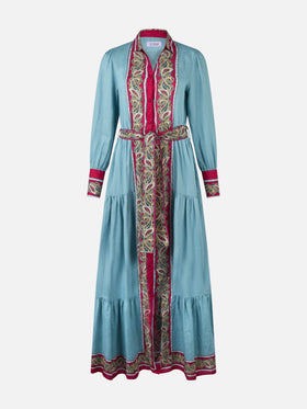 Woman light blue linen dress Jensen with paisley placed print